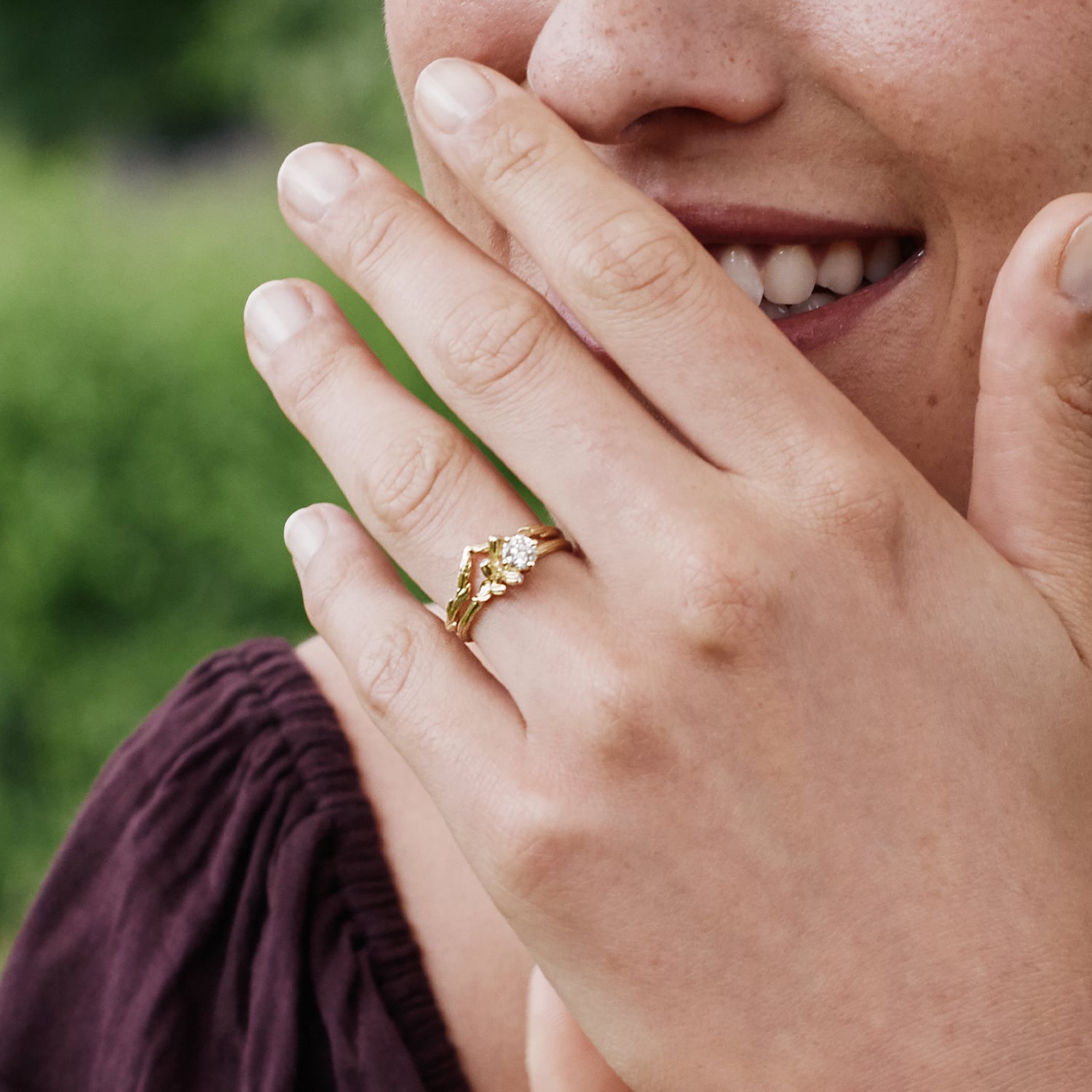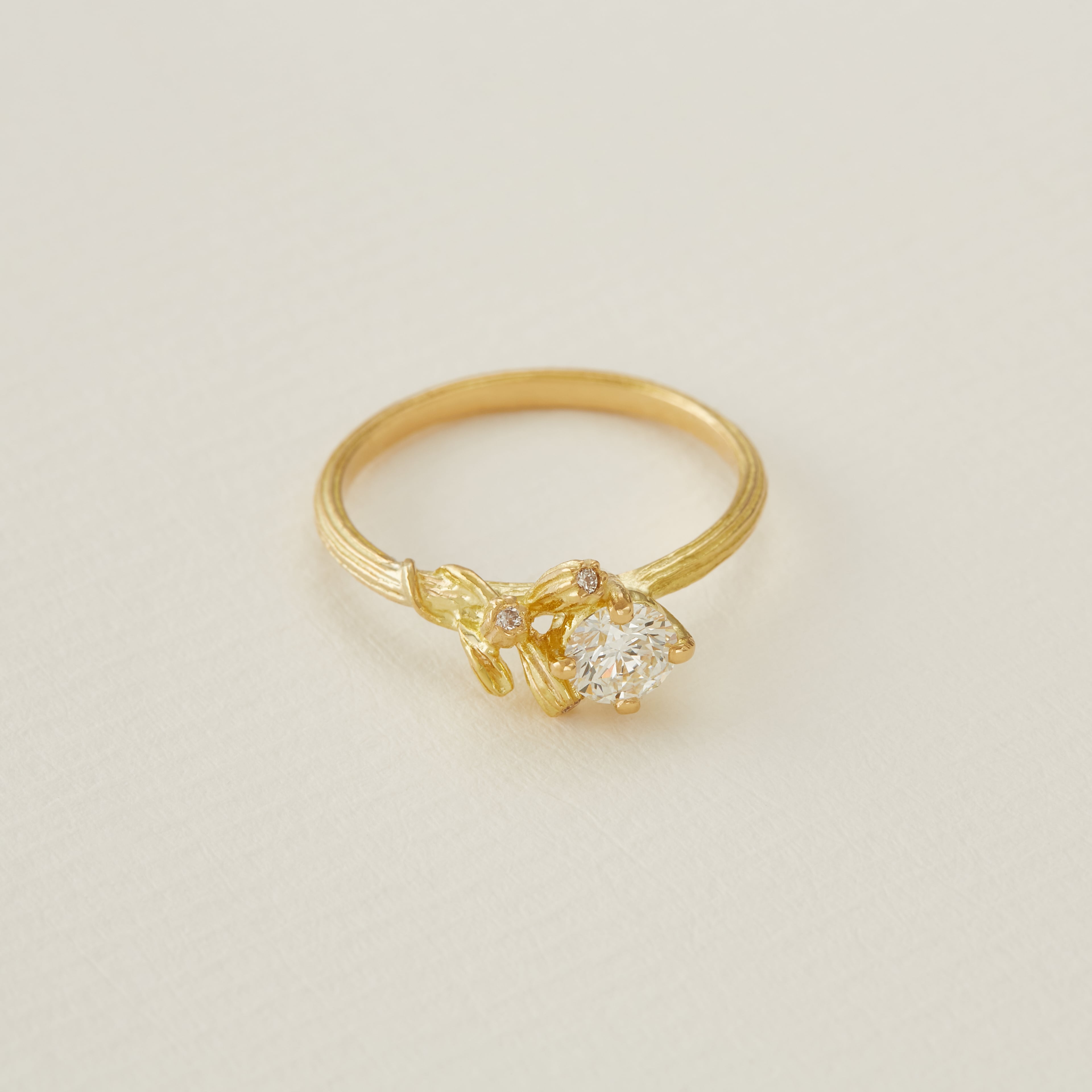 Often known as ‘Kissing Seeds’ - fennel seeds were once often used as a natural breath freshener! Here, delicately detailed seeds are clustered to asymmetrically frame a 0.4ct (4.8 mm) G colour VS1 clarity central Diamond. For extra sparkle, three smaller (1.1 mm) diamonds are set in the top of the seeds, making the total carat weight 0.42ct Handmade in solid 18ct Fairmined Yellow Gold.