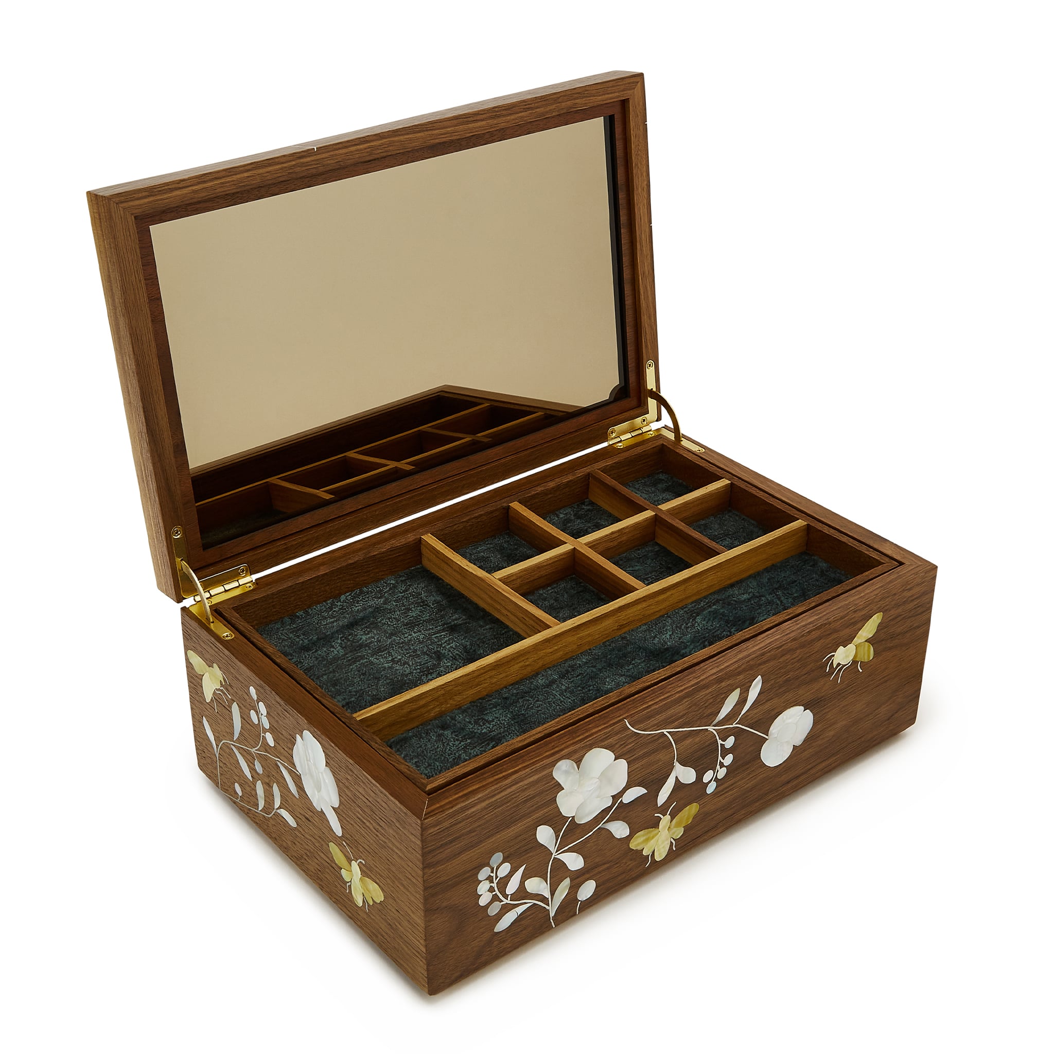 <p>Made from walnut wood, with a smoked glass mirror mounted to the interior, it has plenty of space for storage of your Alex Monroe jewellery!</p>
