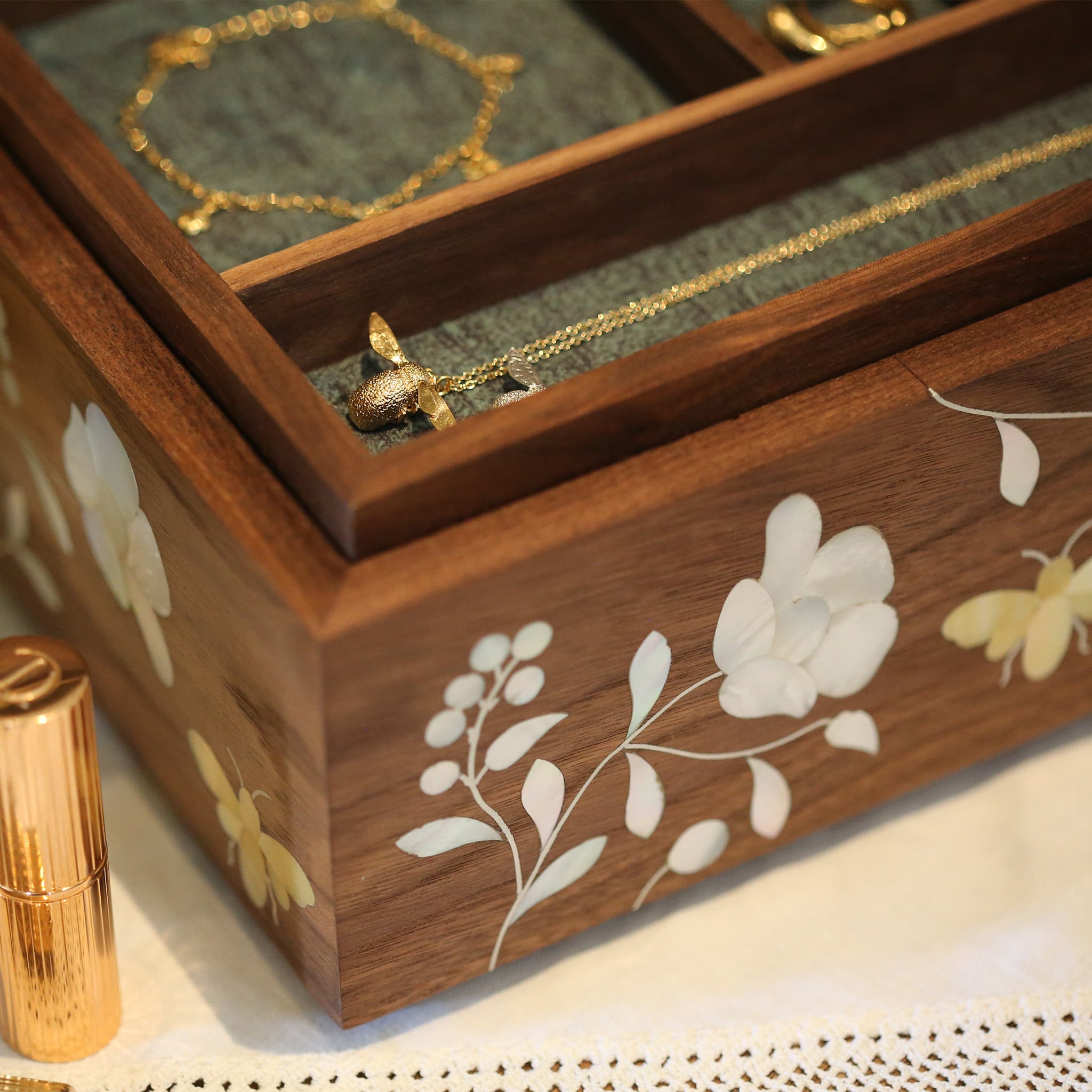 Lined with deep green velvet and finished with matte lacquer, this is a piece to treasure for a lifetime and beyond, and is a true celebration of traditional craft.