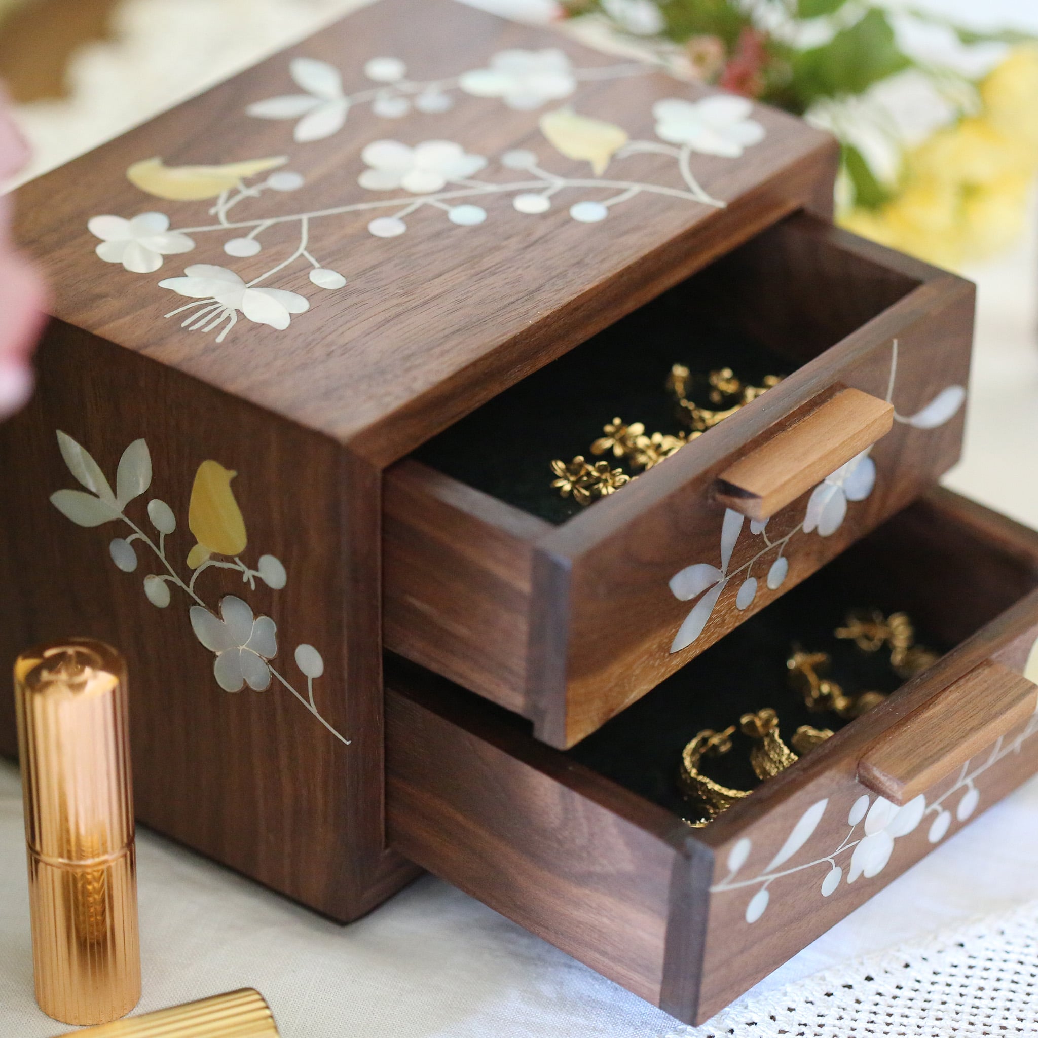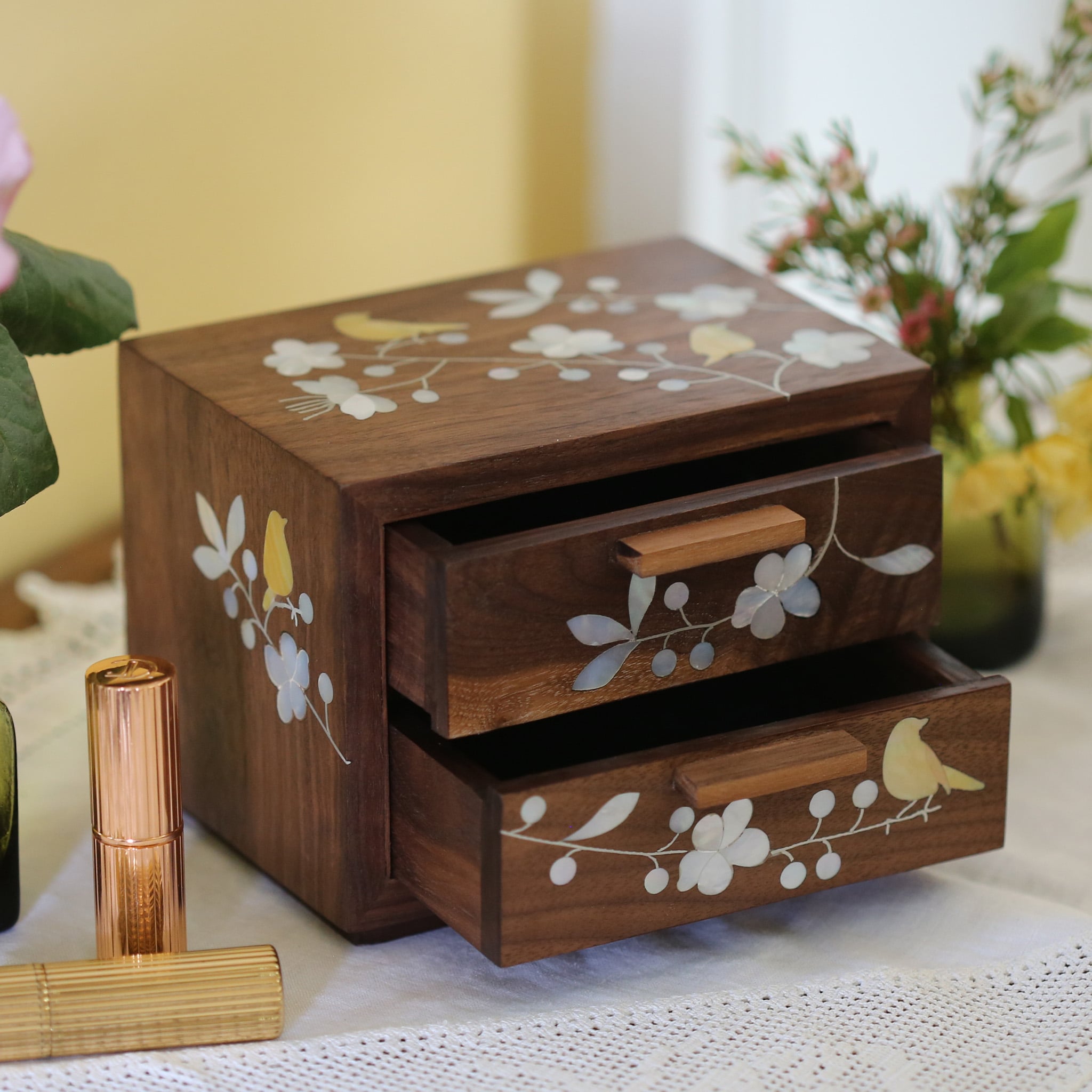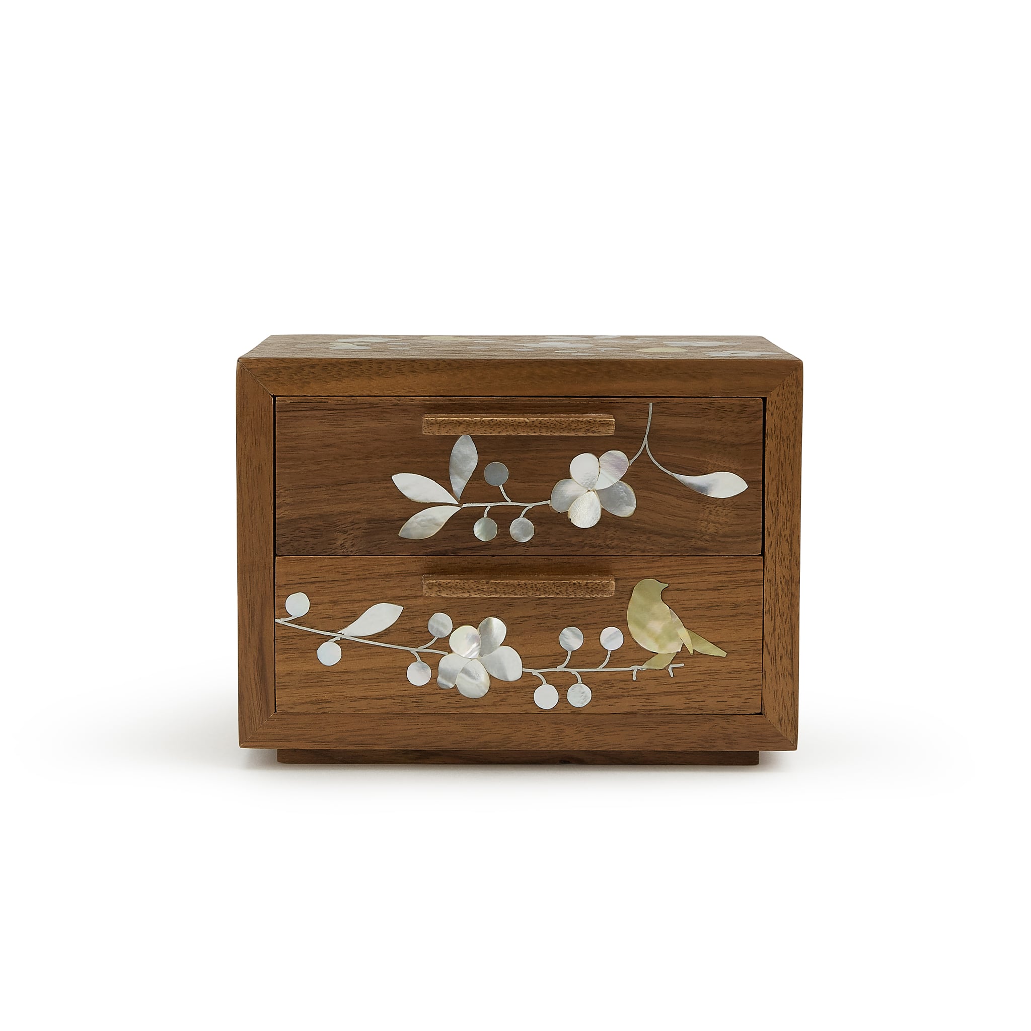 <p><span style="font-weight: 400;">Made from walnut wood, with two drawers for neat storage of your Alex Monroe jewellery, it has plenty of space for your everyday pieces!</span></p>
