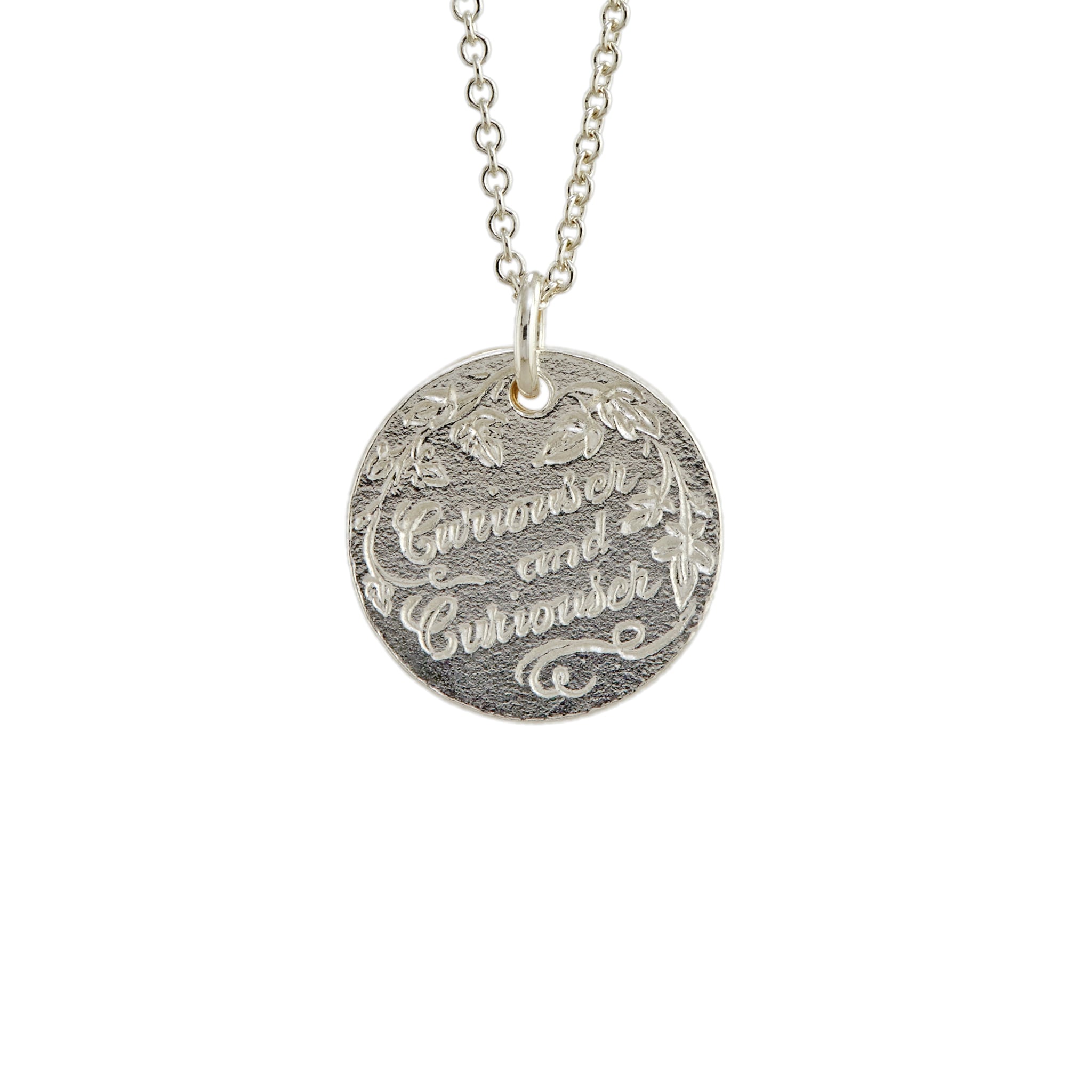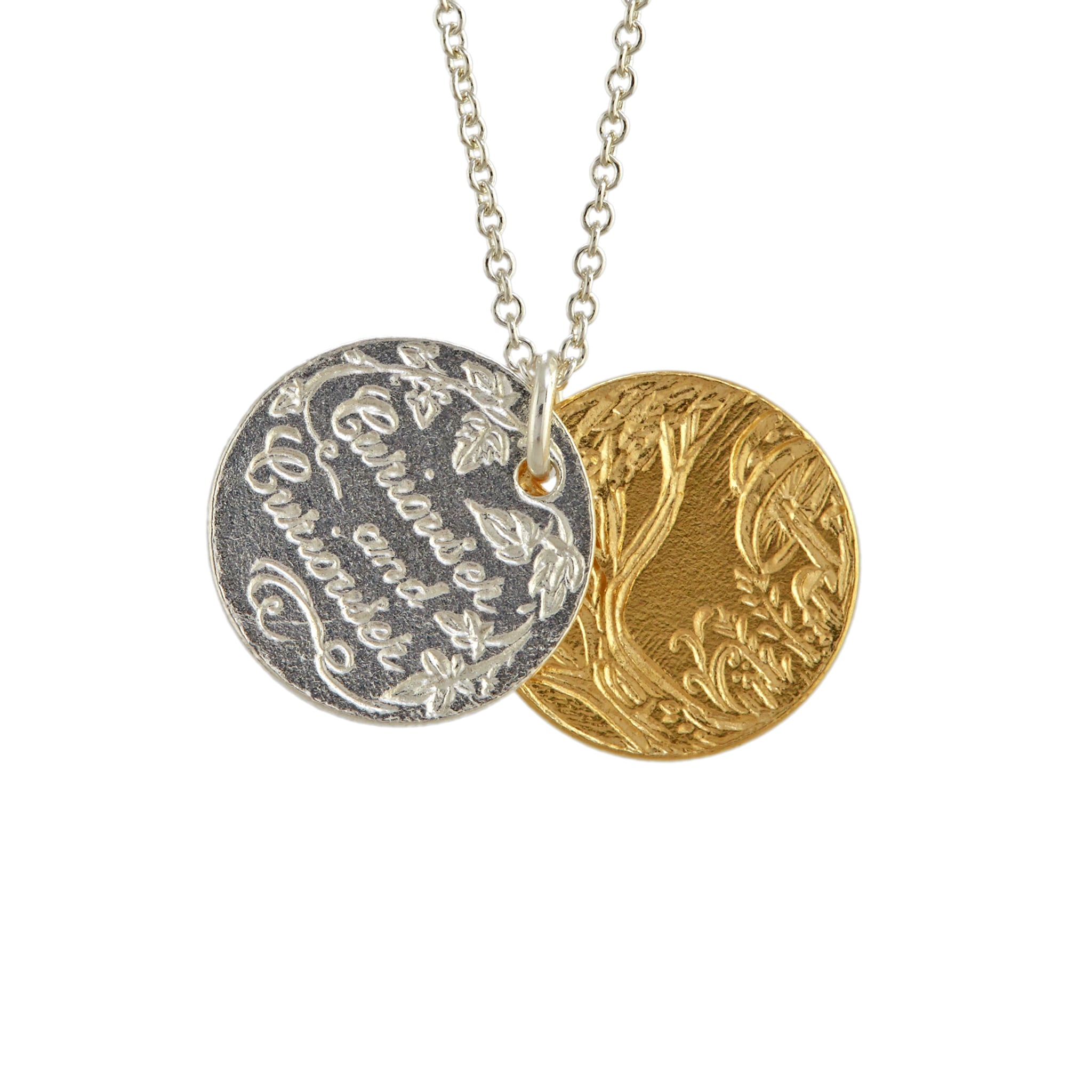 A sterling silver disc engraved with the words 'Curiouser and Curiouser’, moves away to reveal a magical world beneath in this Limited Edition pendant necklace. The front disc is handmade in sterling silver, with the disc behind plated in 22ct gold.