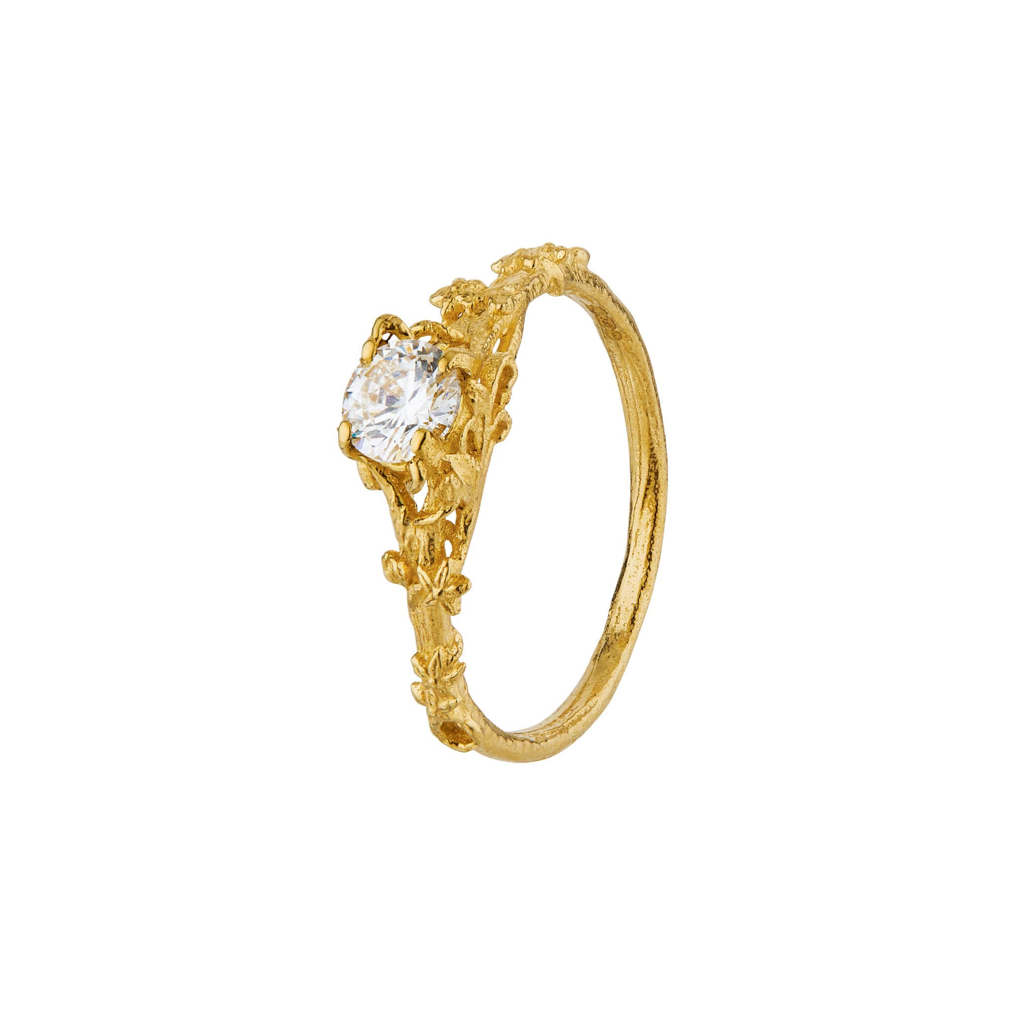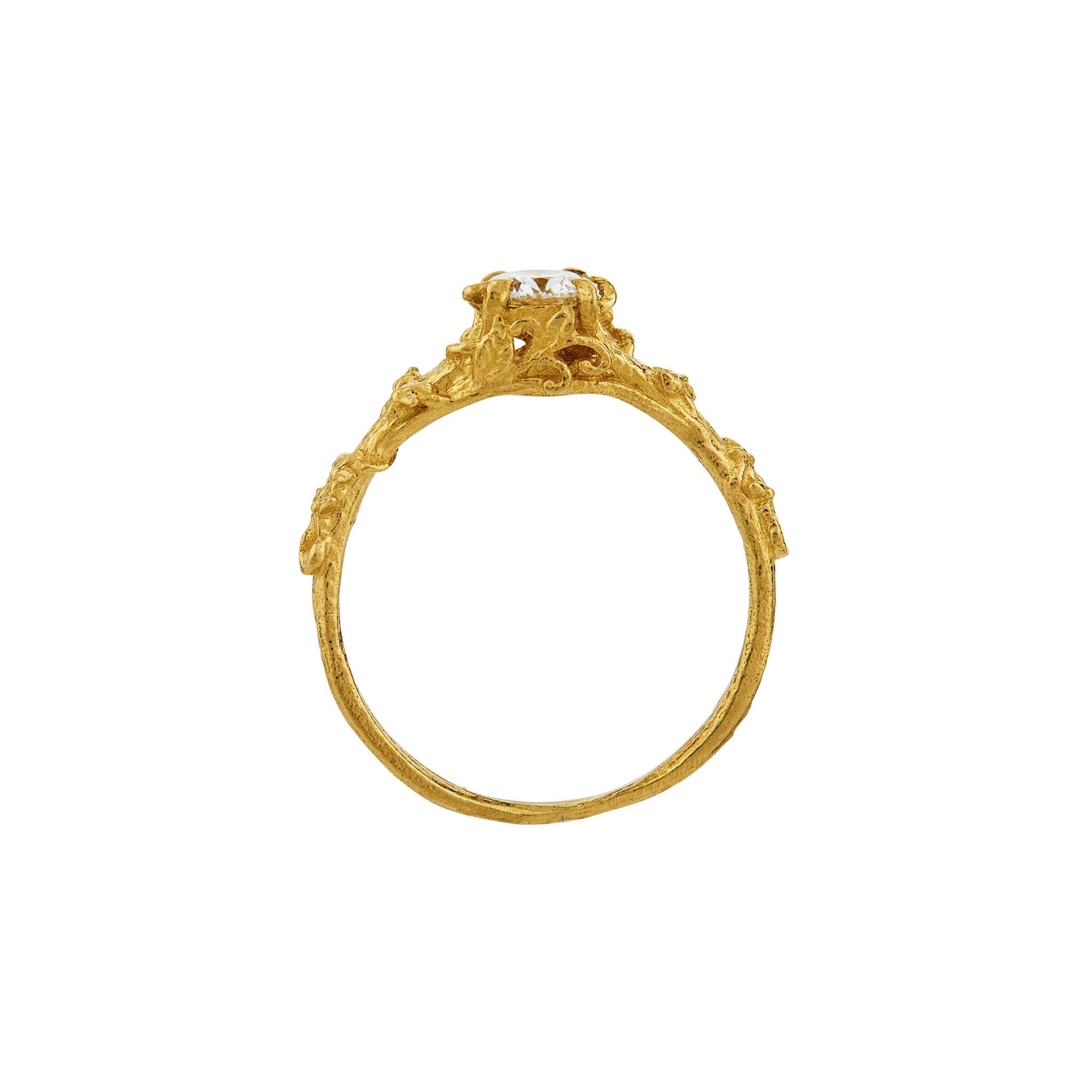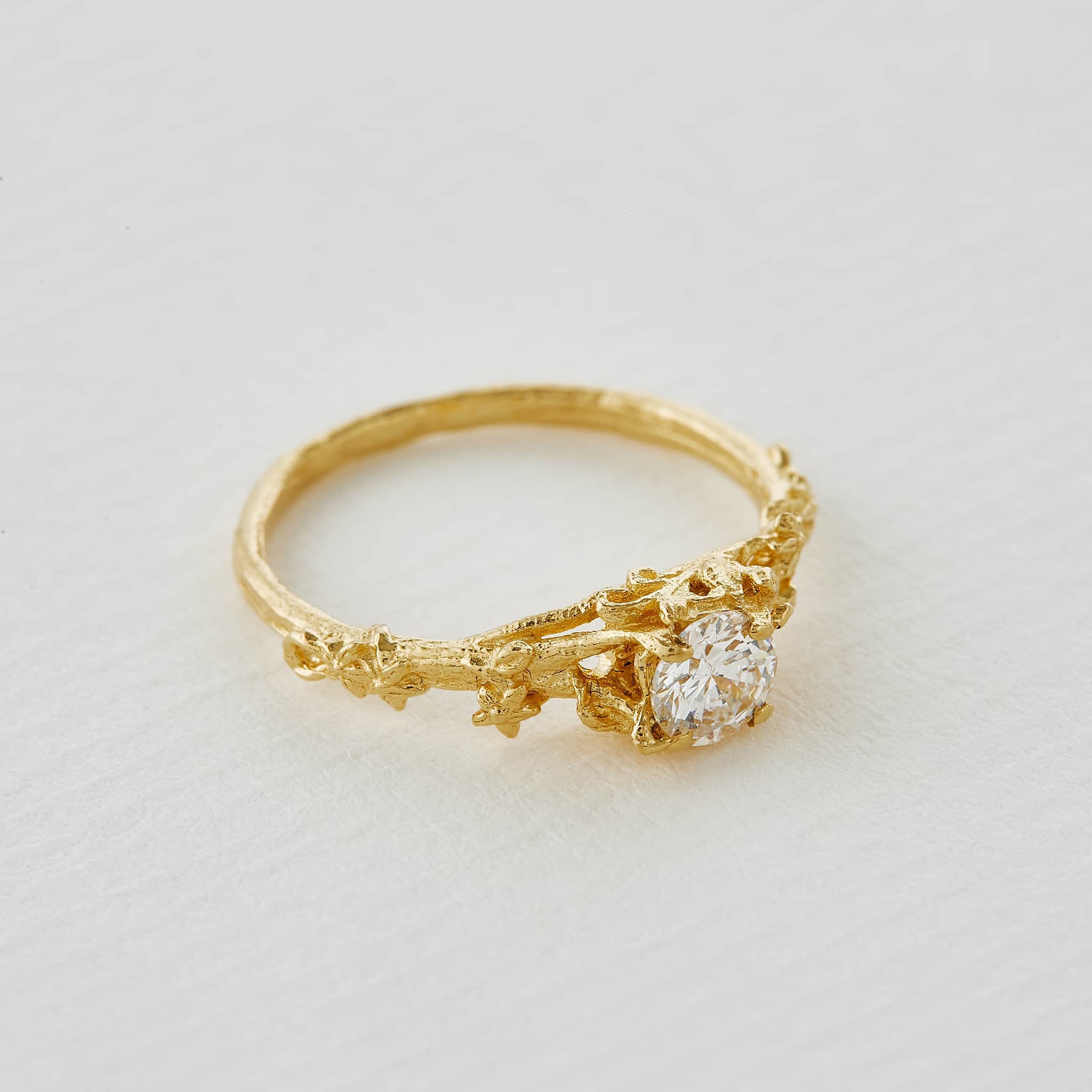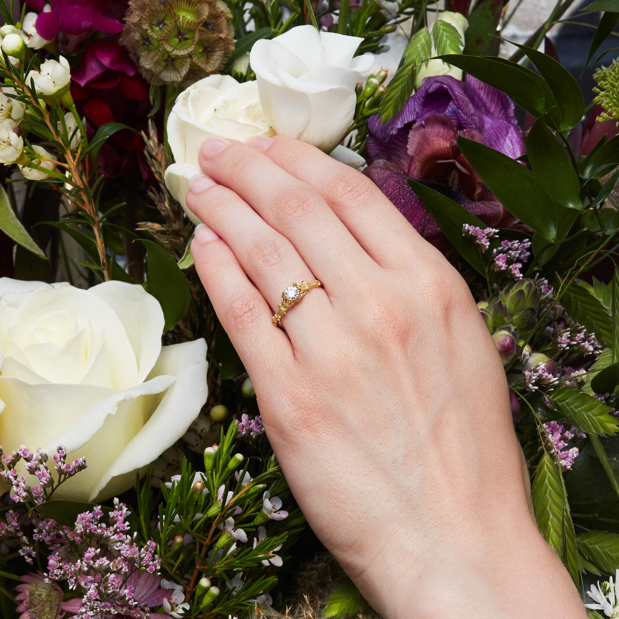 A fine, bark textured ring is detailed with a vine of leaves and flowers and set with a 4.4mm brilliant cut diamond! Handcrafted from 18ct gold or platinum, all Alex Monroe Fine Jewellery is handcrafted in our London Studios.