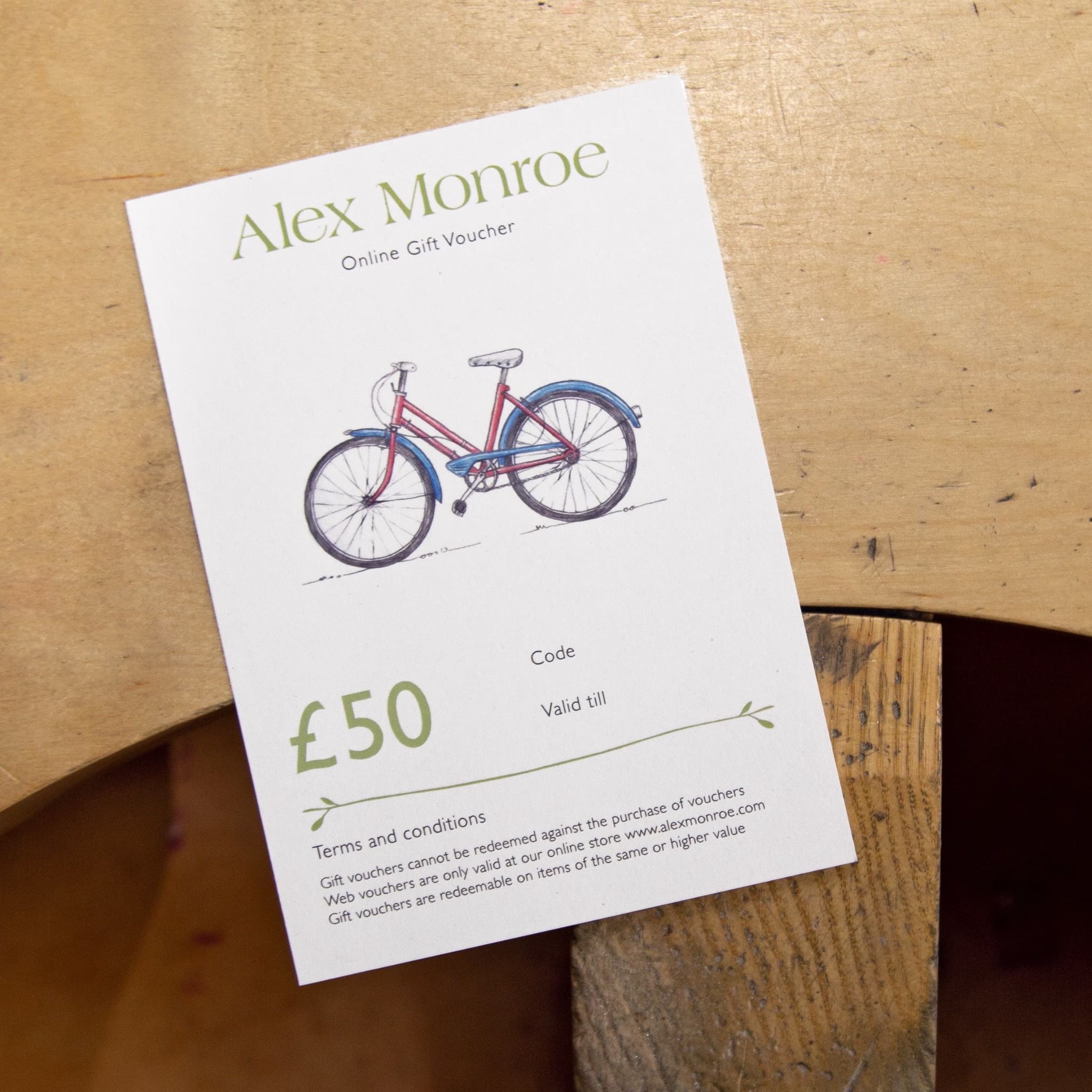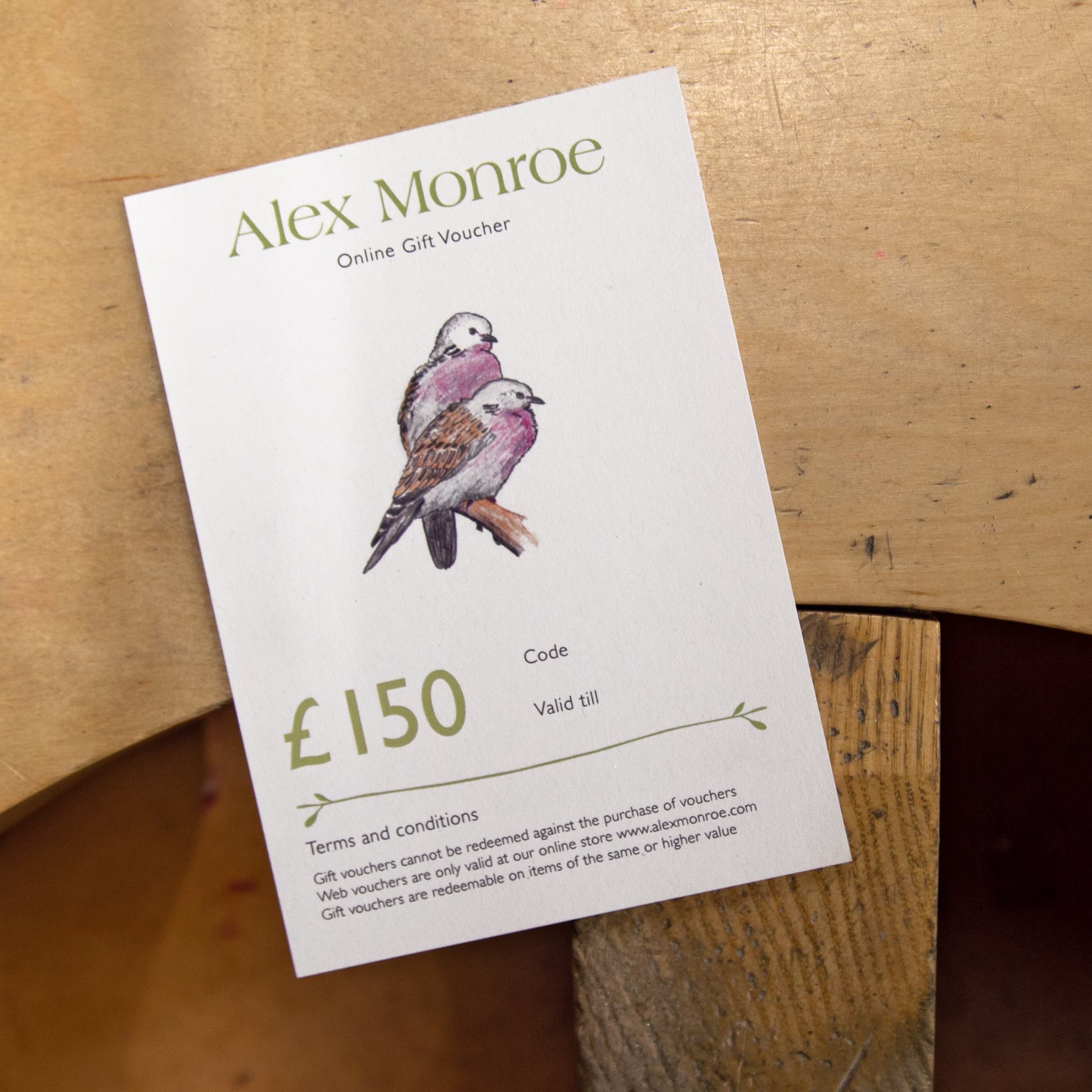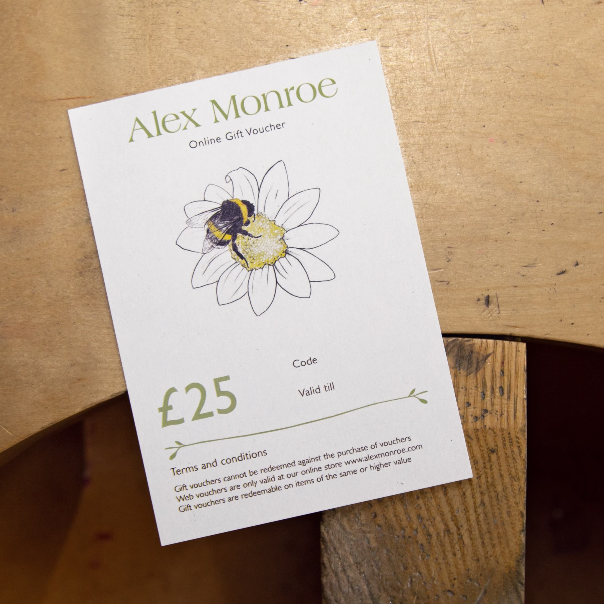 <p> </p></div></div></div>Gift Voucher254.6https://www.alexmonroe.com/media/catalog/product/5/0/50-gift-voucher.jpghttps://www.alexmonroe.com/media/catalog/product/1/0/100-gift-voucher.jpghttps://www.alexmonroe.com/media/catalog/product/1/5/150-gift-voucher.jpgGIFT-VOUCHERbrand:Gift Vouchersku:GIFT-VOUCHERtype_of_product:Gift Voucherdiscount_excluded:Yesimage:/v/o/voucher.jpgis_personalisation_option:Nolifestyle_image:/5/0/50-gift-voucher.jpgsmall_image:/5/0/50-gift-voucher.jpgthumbnail:/5/0/50-gift-voucher.jpgGift VoucherYes/v/o/voucher.jpgNo/5/0/50-gift-voucher.jpgGIFT-VOUCHER/5/0/50-gift-voucher.jpg/5/0/50-gift-voucher.jpgGift VoucherNoNo
