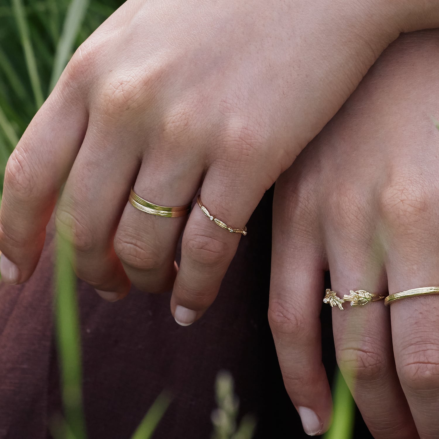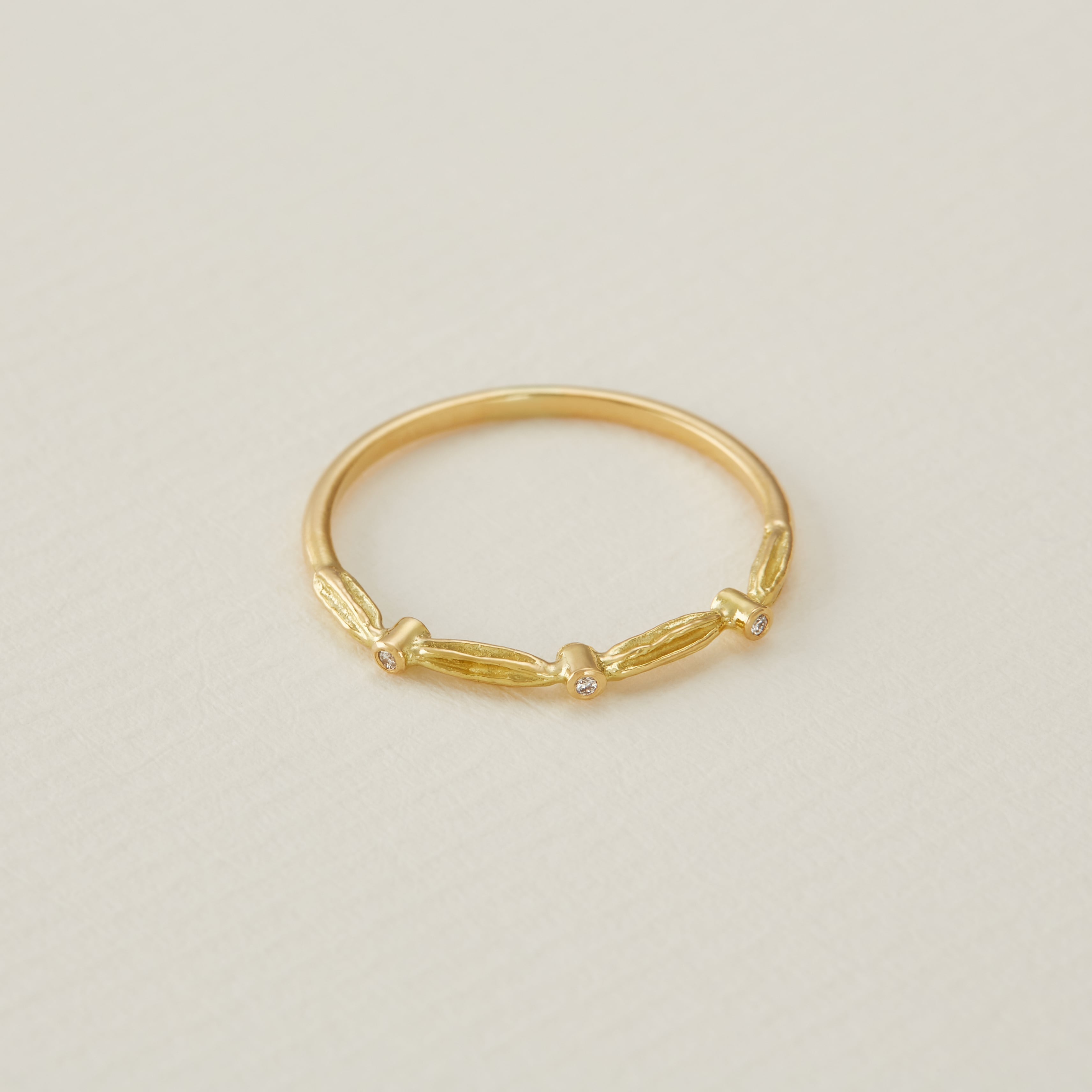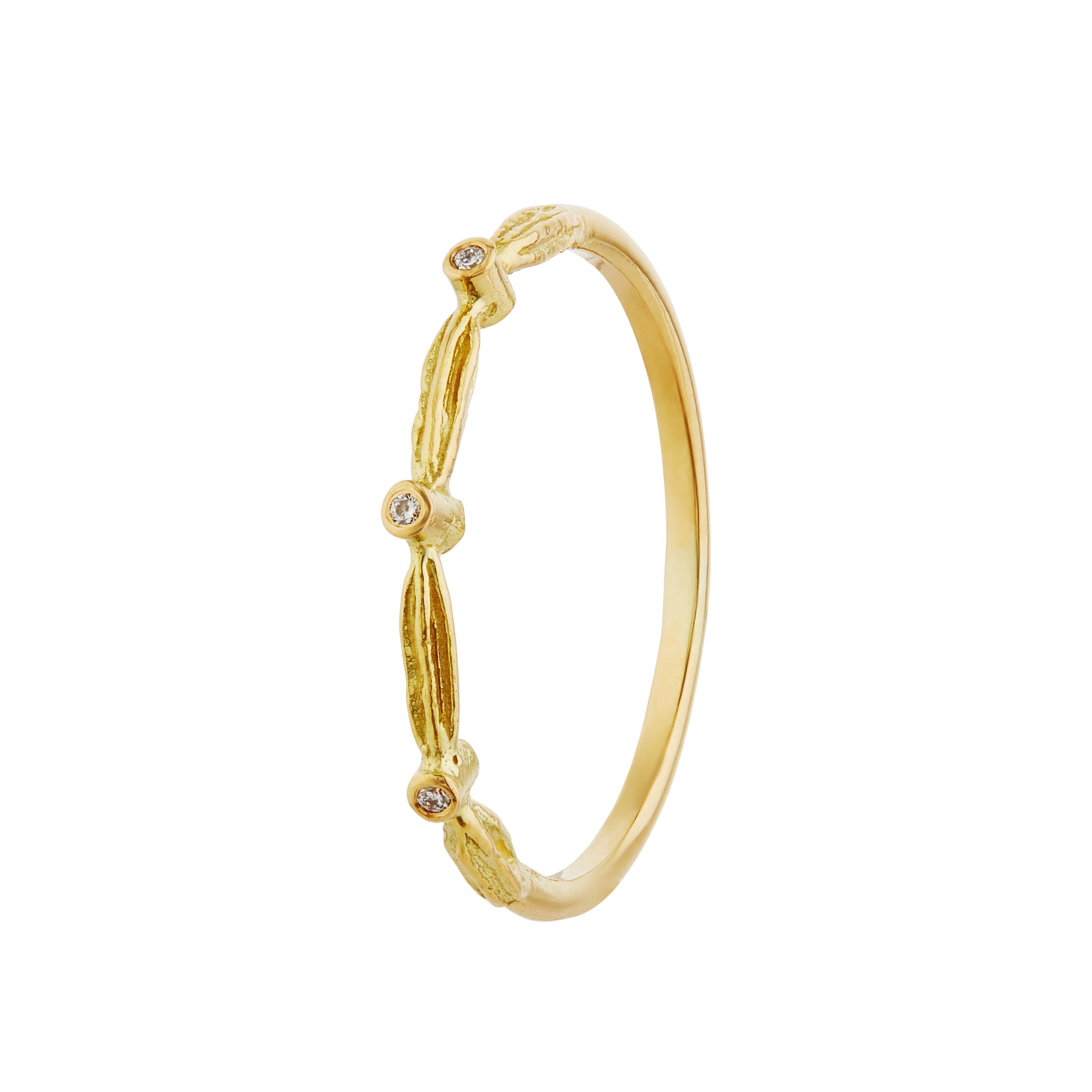 Often known as ‘Kissing Seeds’ - fennel seeds were once often used as a natural breath freshener! Here, delicately detailed seeds are placed in line to form a band ring, with three small (1mm) diamonds providing a touch of sparkle - total carat weight 0.015ct Handmade in solid 18ct Fairmined Yellow Gold.
