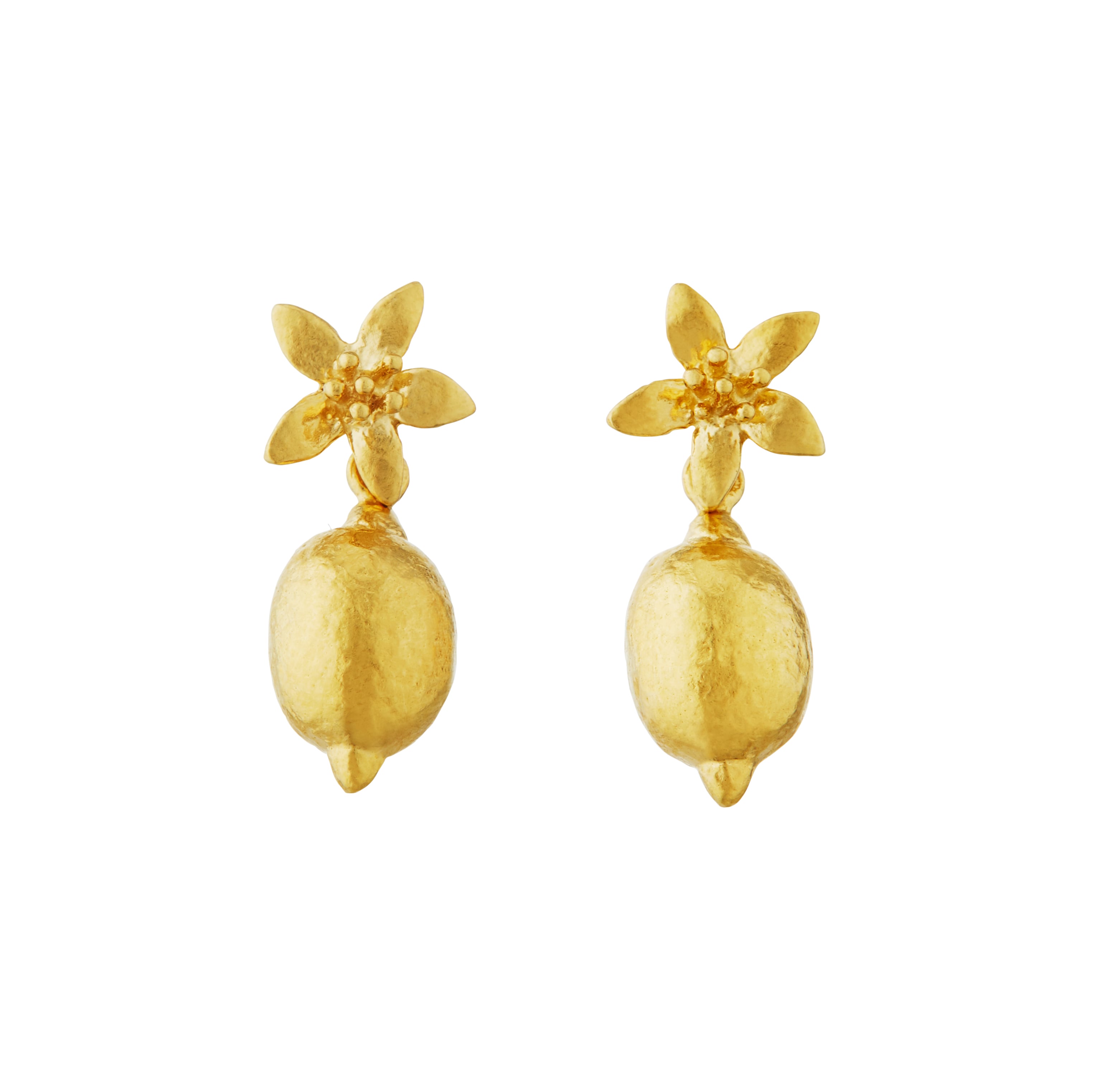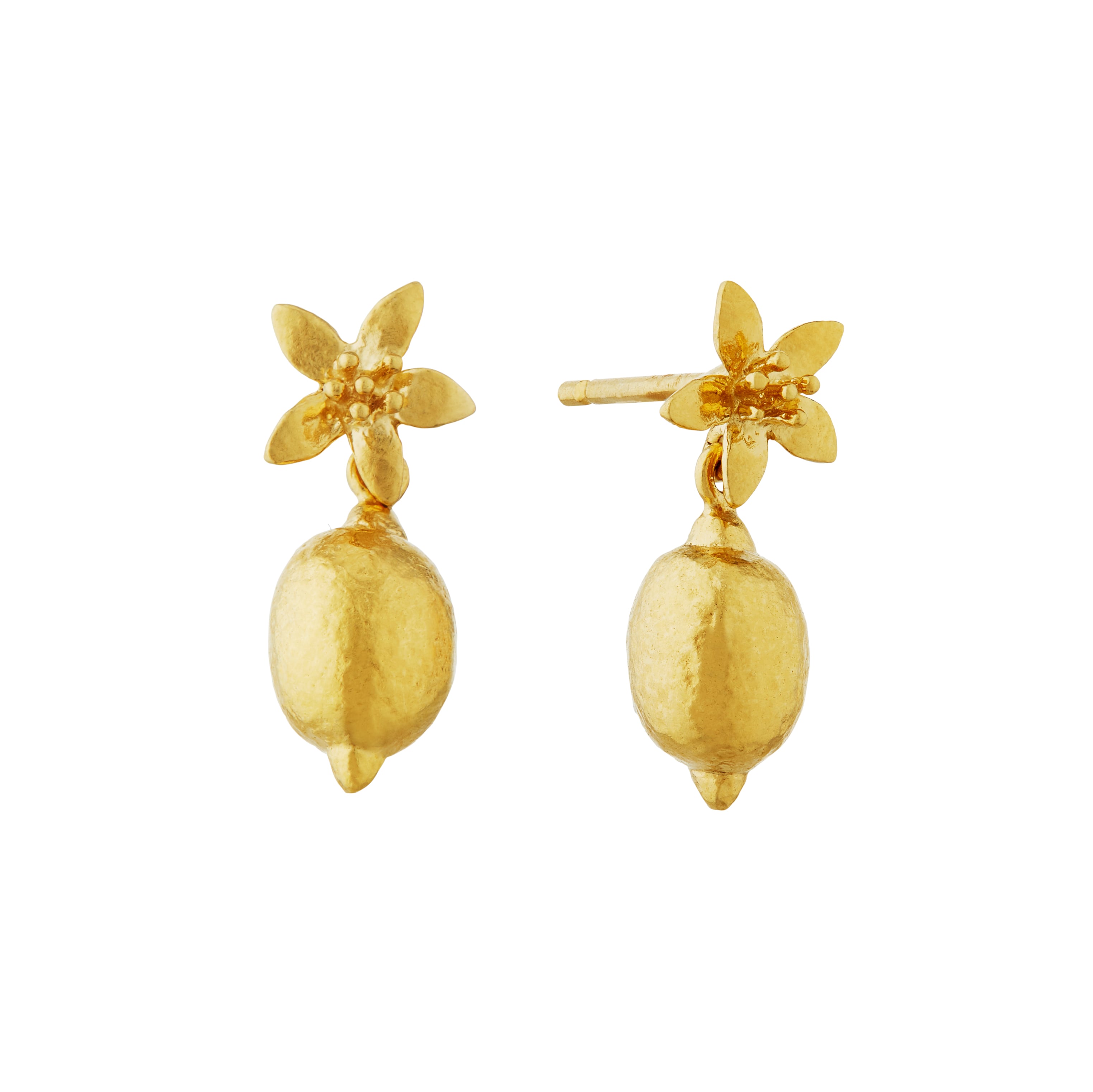 Luscious little lemons drop down gently from lemon blossom flowers, to form these pretty stud drop earrings. Handmade in Sterling Silver and plated with Fairmined Gold.