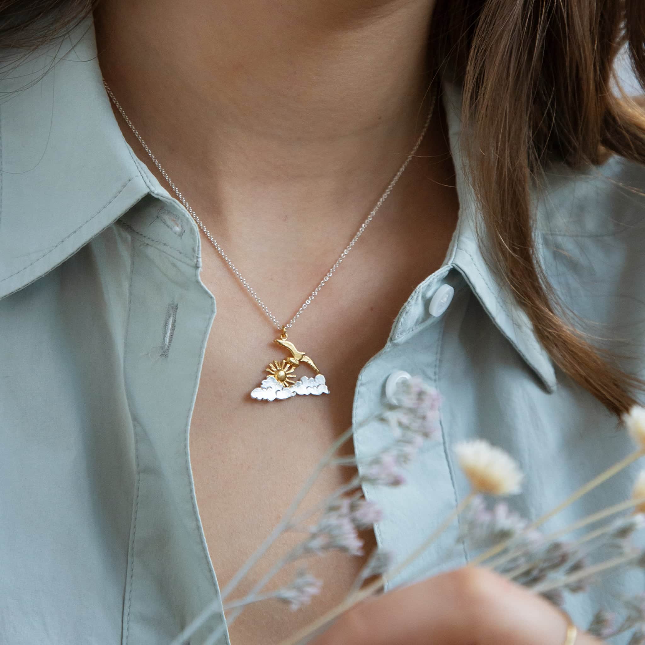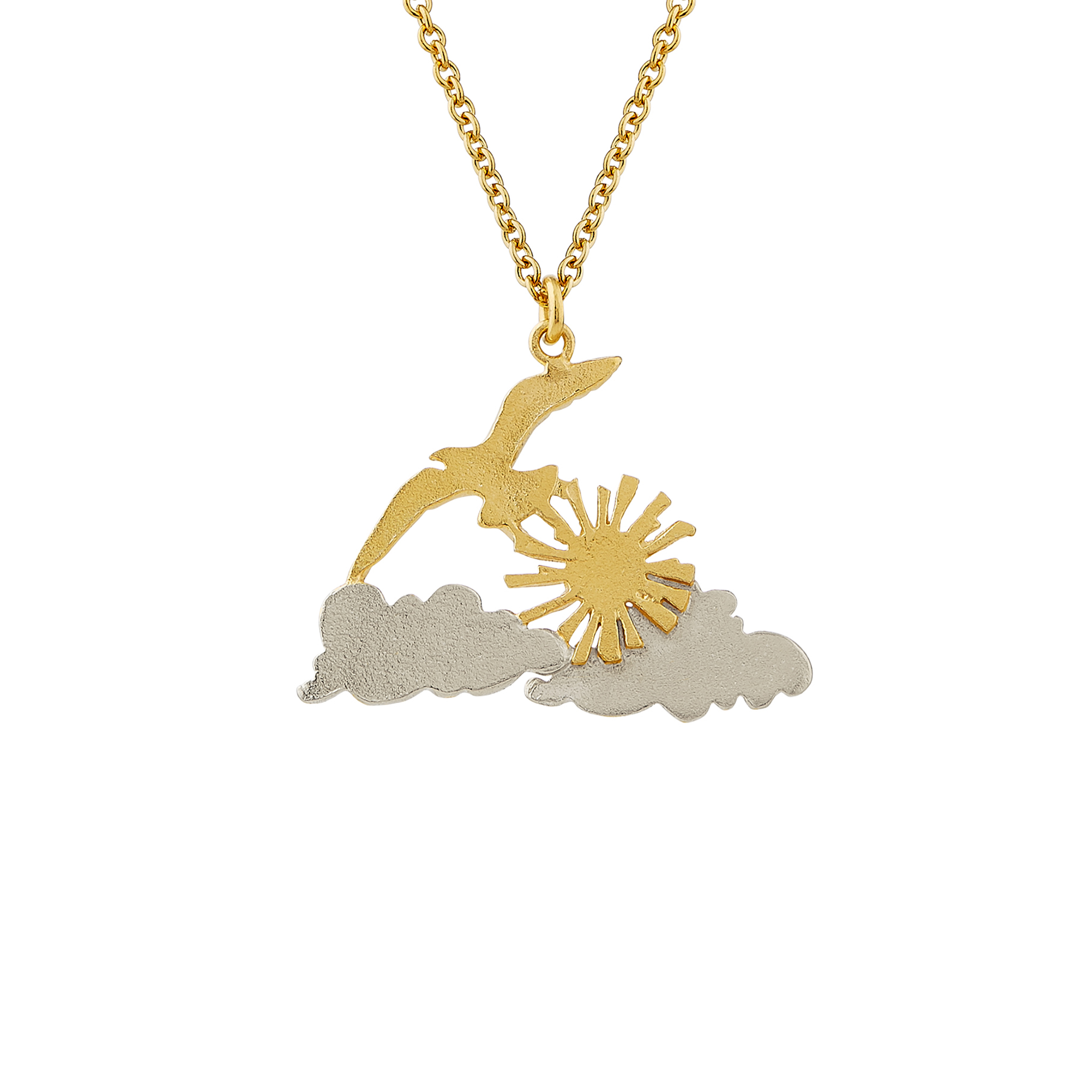 A bird soars through the skies as the golden sun rises behind the clouds, in this uplifting pendant necklace. Gather your dreams and set sail towards an infinite horizon of hope and adventure in this magical collection. Gather a Dream evokes feelings of hope, romance and new beginnings in light of challenging times. A resilient mixed-metal collection with an uplifting reminder that every day is a new beginning and the sun will always come out from behind the clouds.