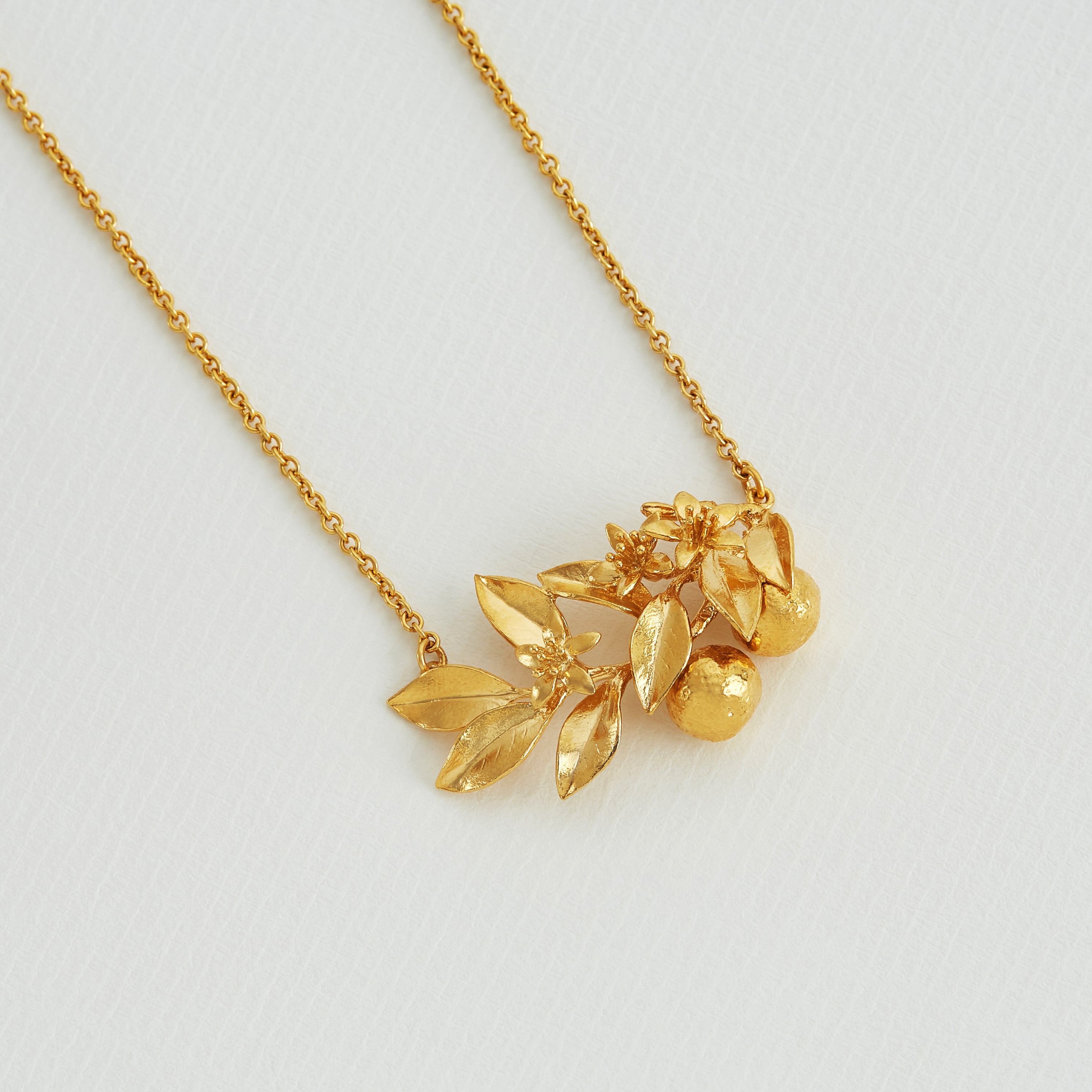 Two juicy looking oranges nestled amongst leaves and blossoms move breezily from a textured branch, formed into an in-line necklace. Handmade in Sterling Silver and plated with Fairmined Gold.