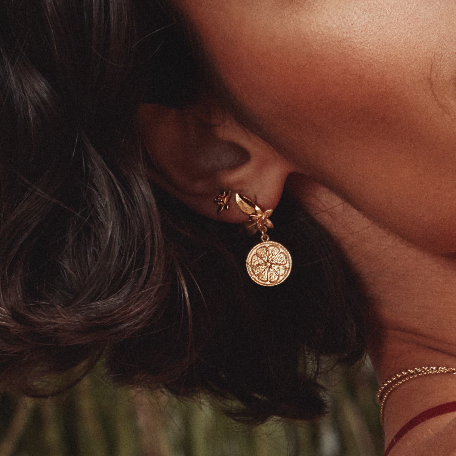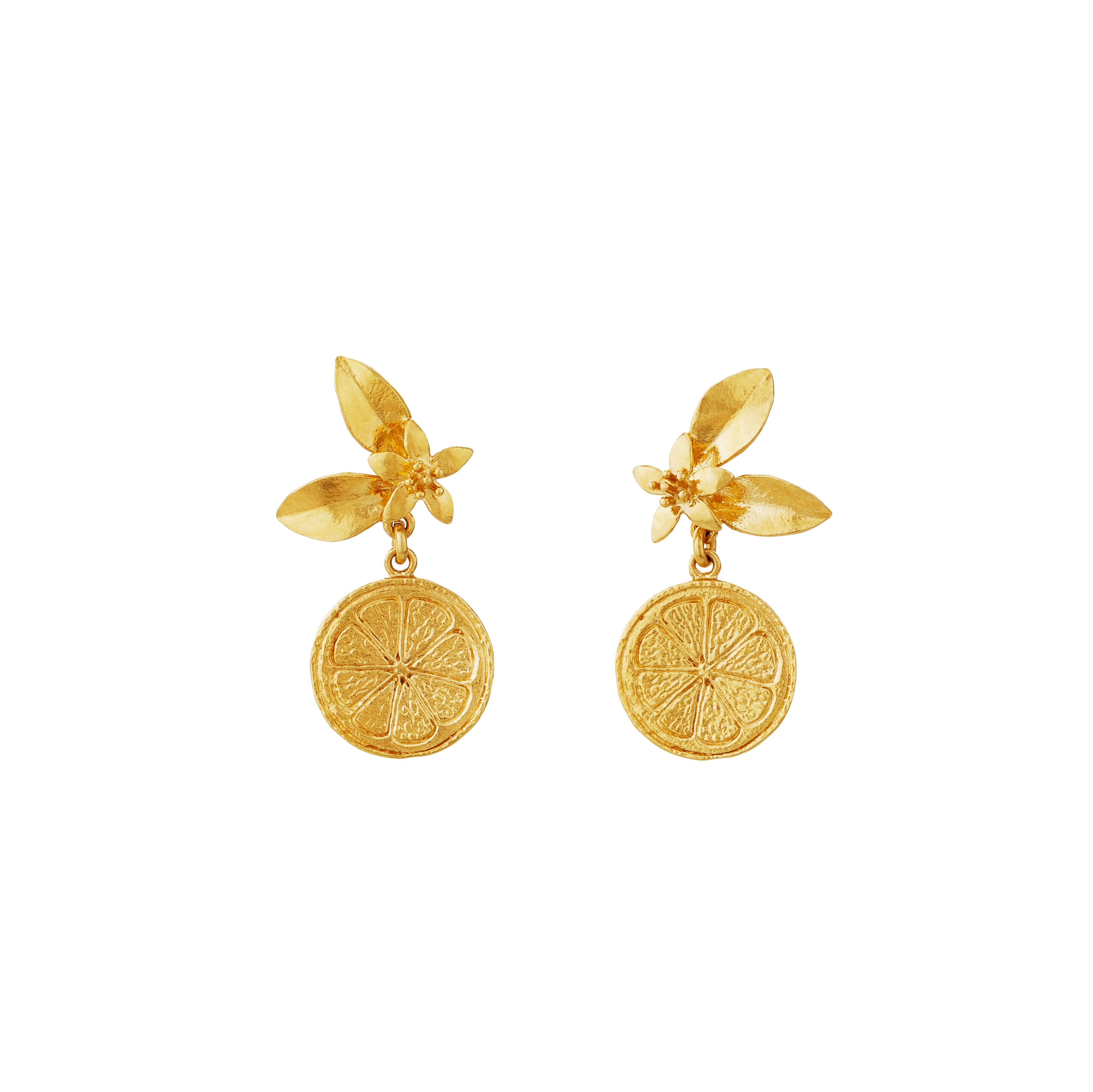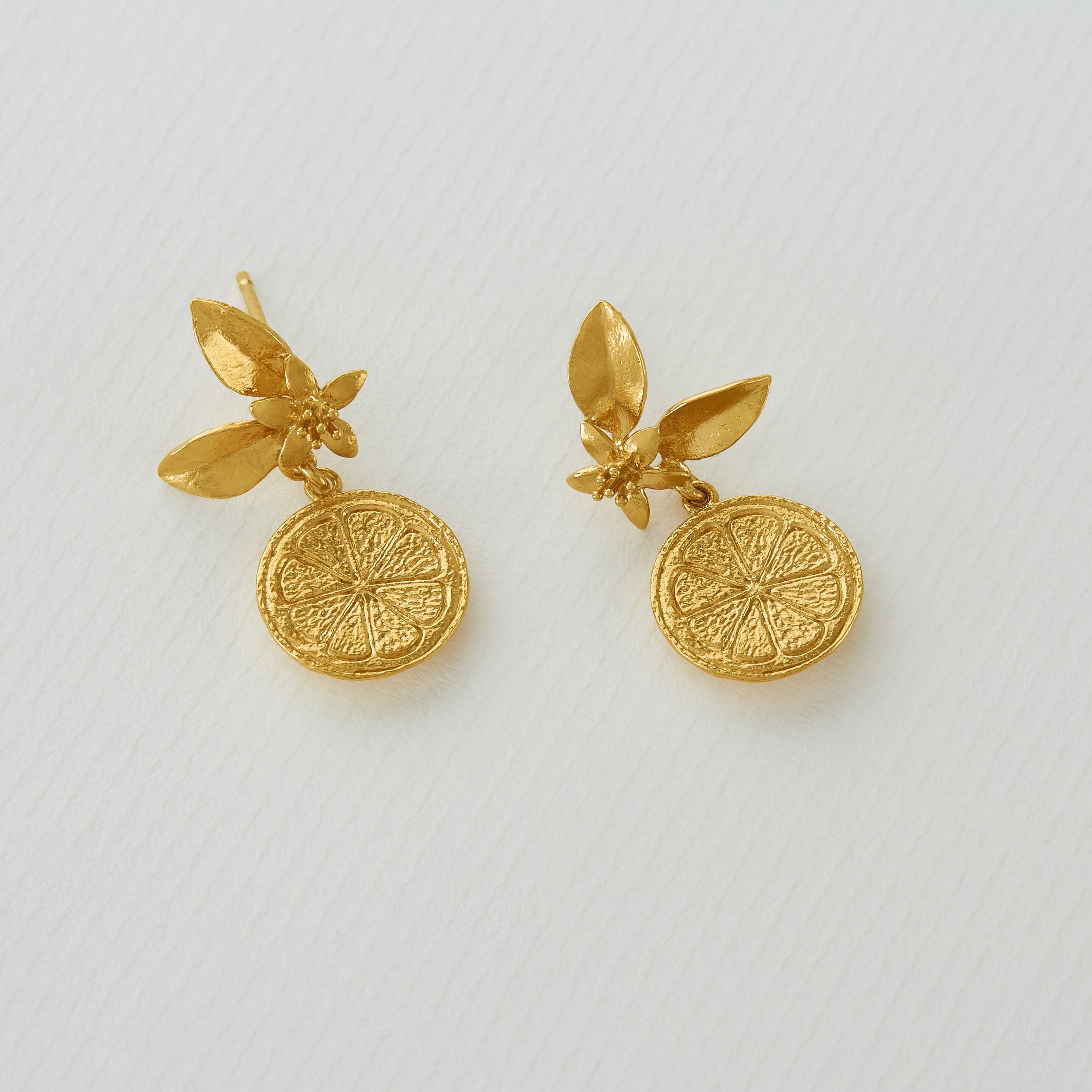 Juicy looking orange slices hang from orange blossom flowers, to form these stud drop earrings. Handmade in Sterling Silver and plated with Fairmined Gold.
