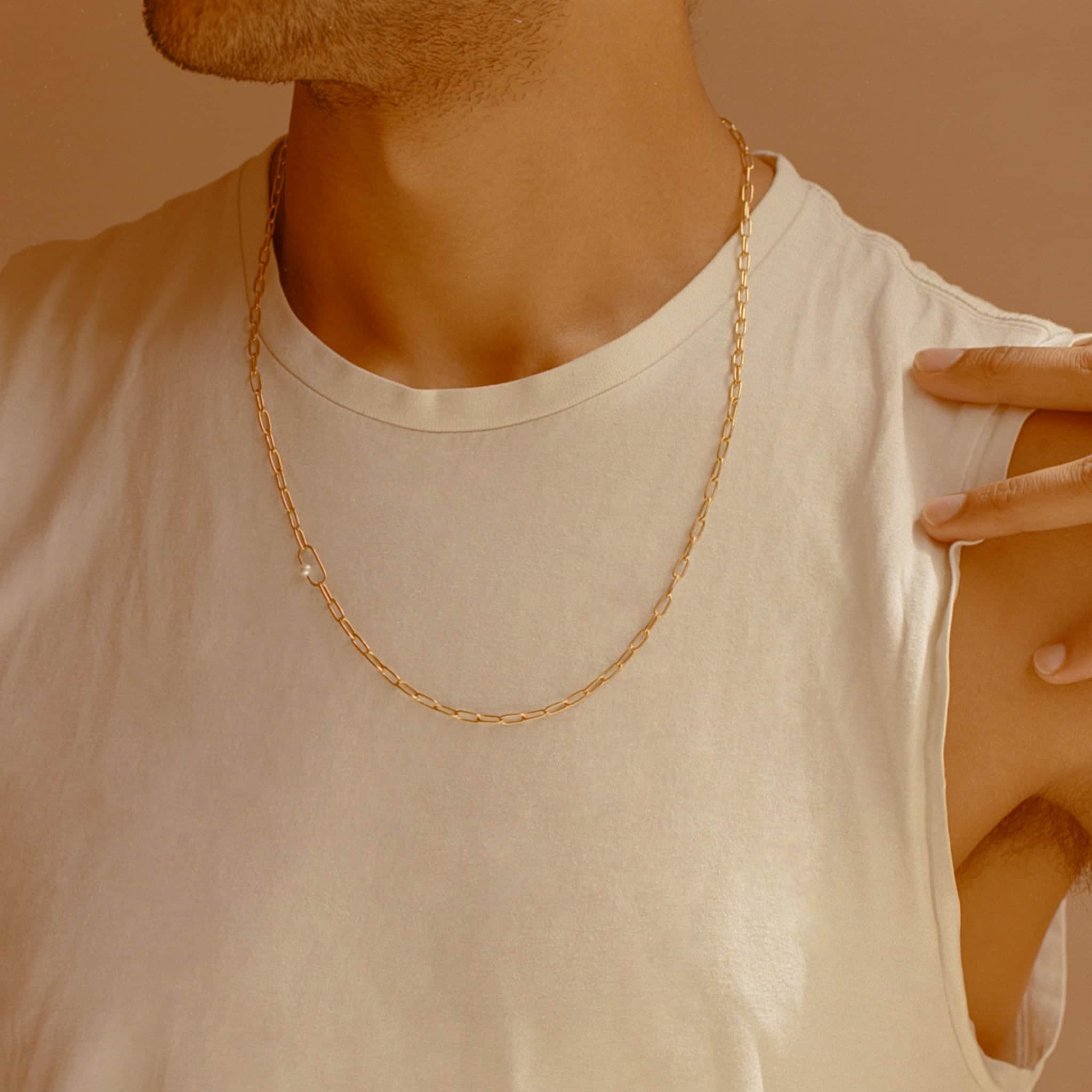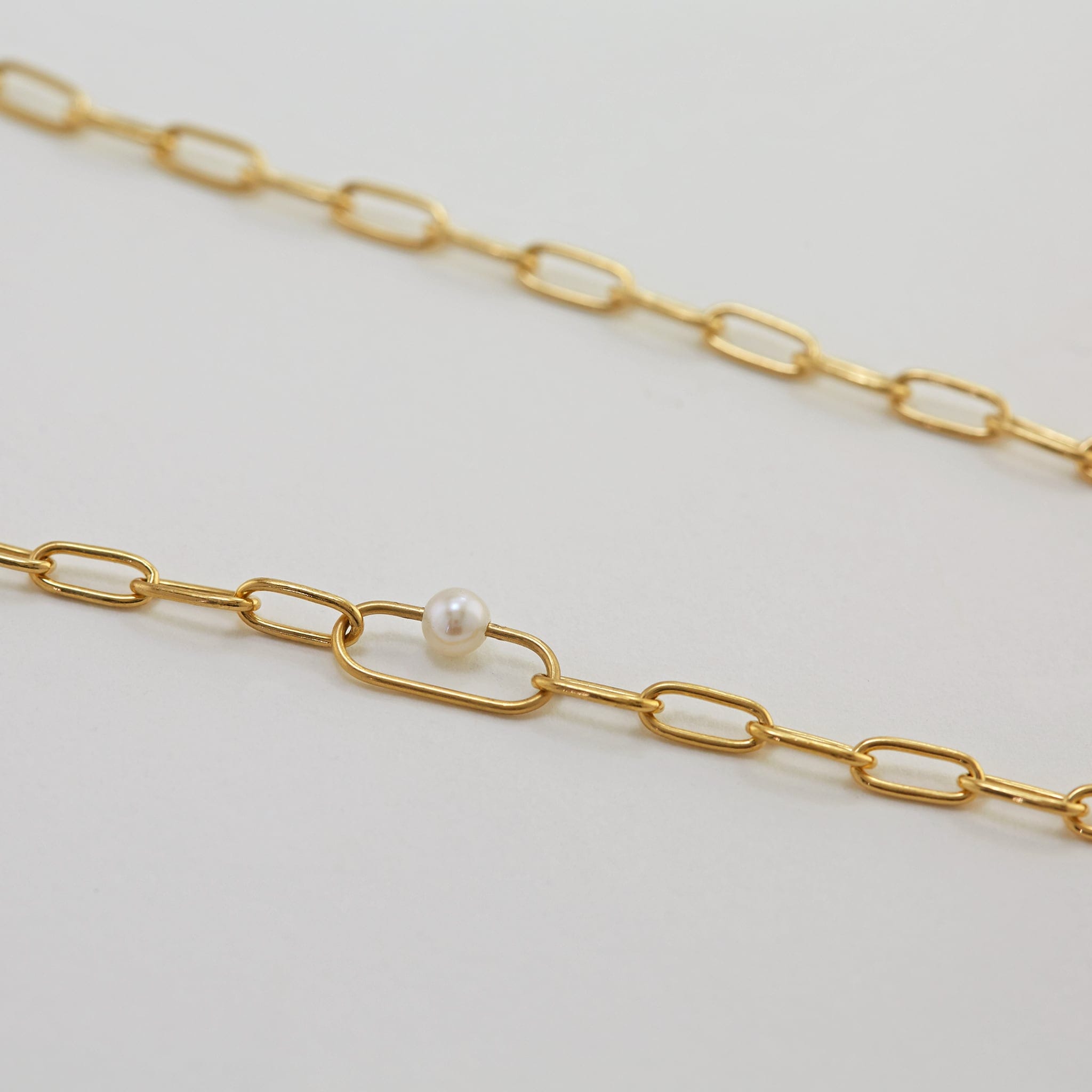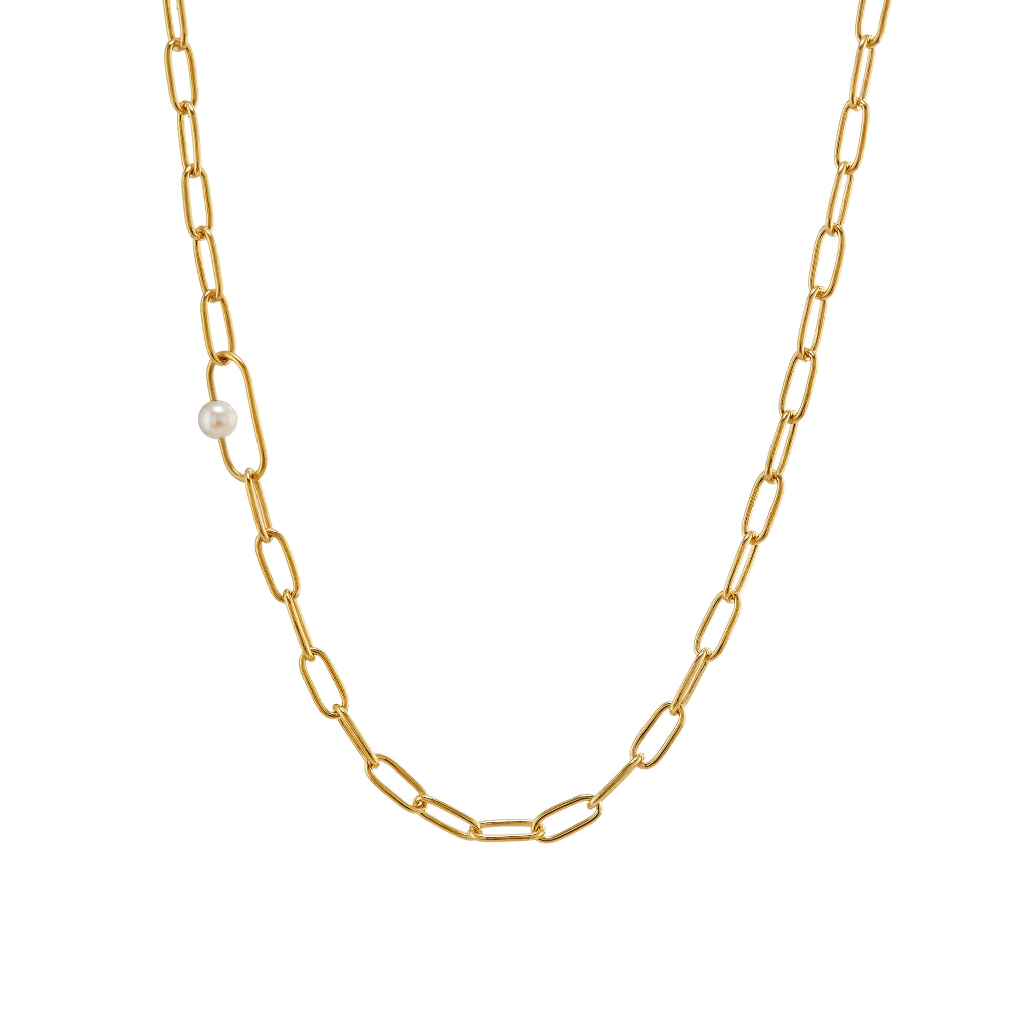 Look closely and you’ll discover a single link punctuated by a smooth freshwater pearl in this clean, wide-set chain necklace.