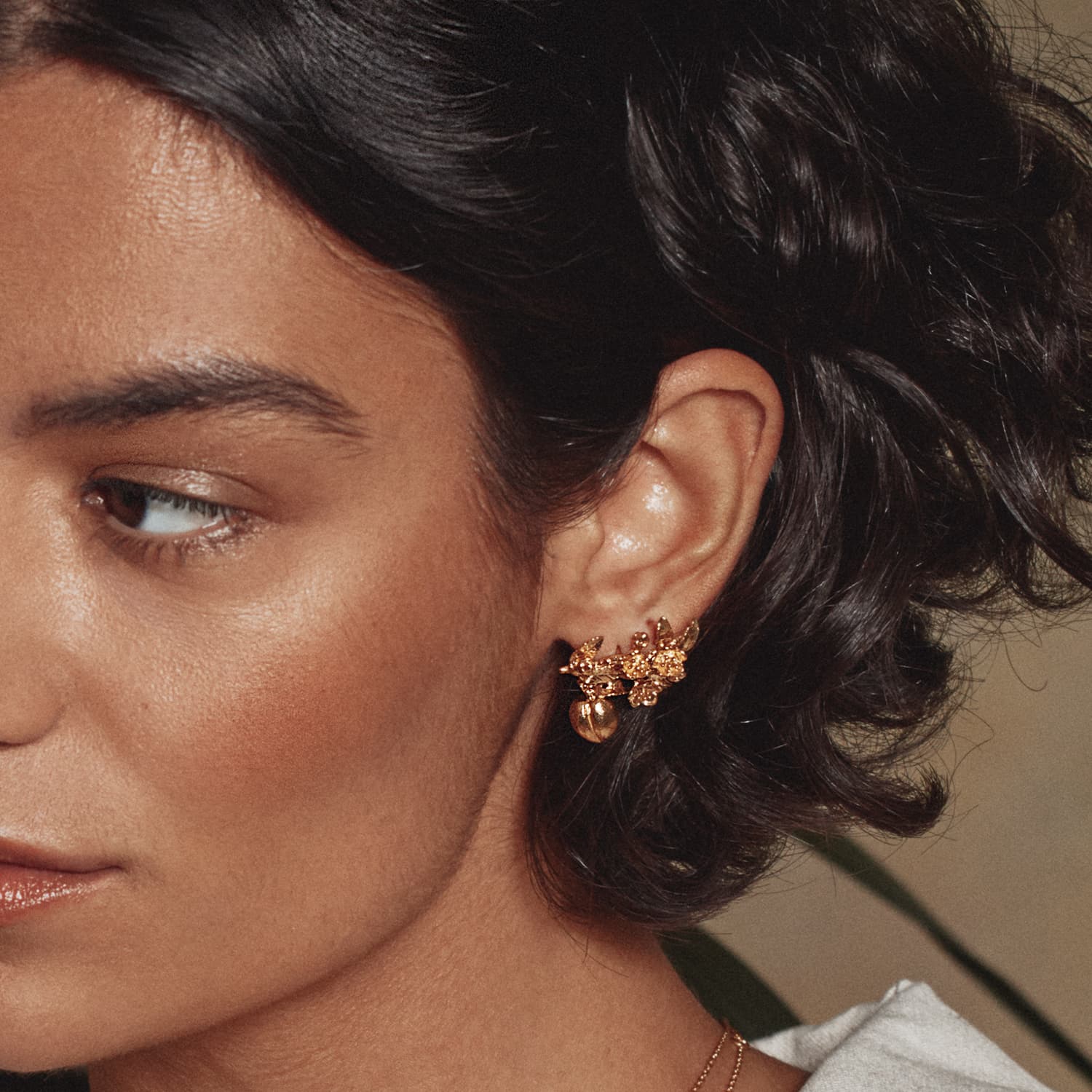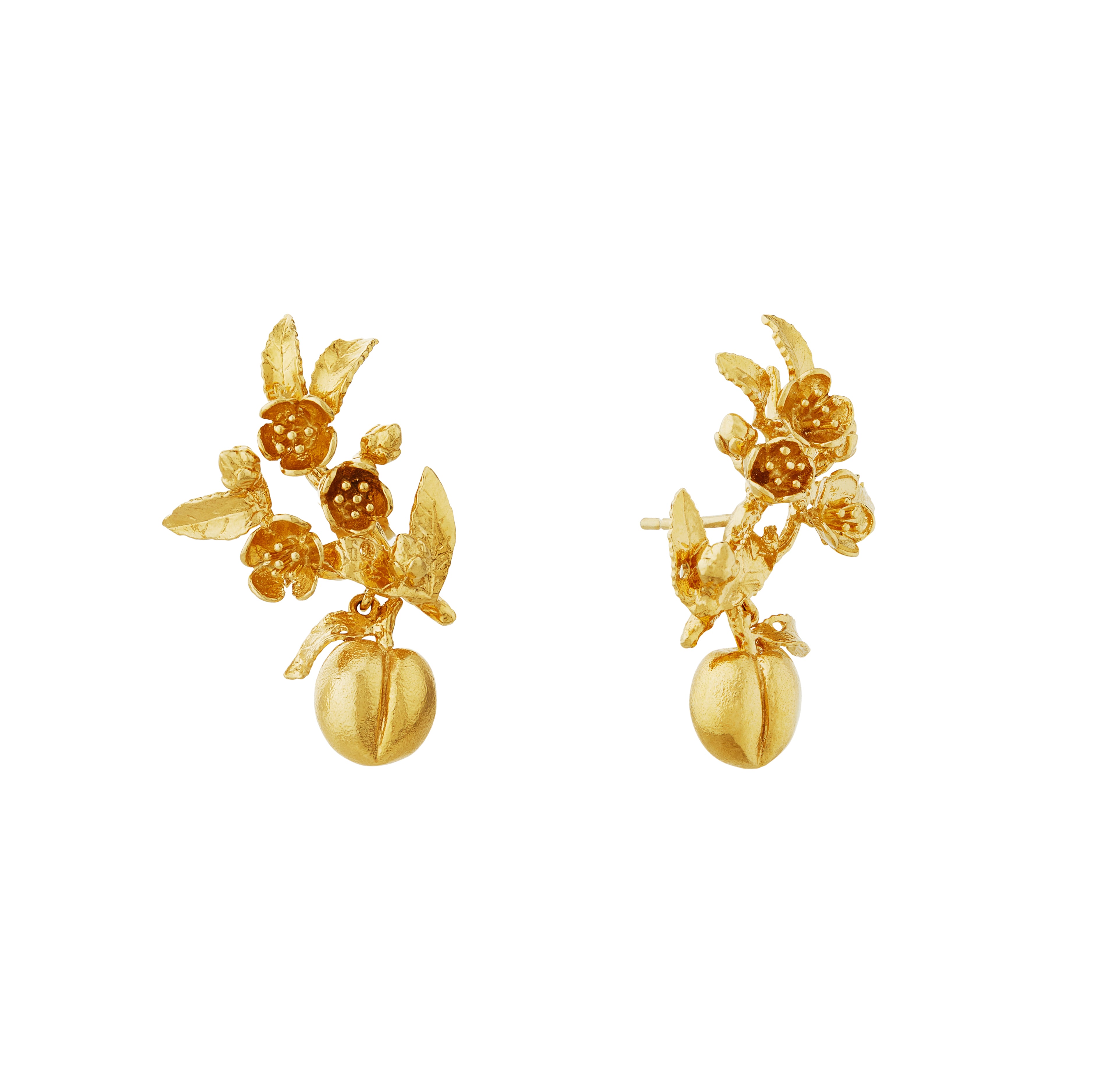Plump peaches jangle playfully from a textured branch abundant with blossom, to form glamorous, stud earrings which gently climb the ear. Handmade in Sterling Silver and plated with Fairmined Gold.