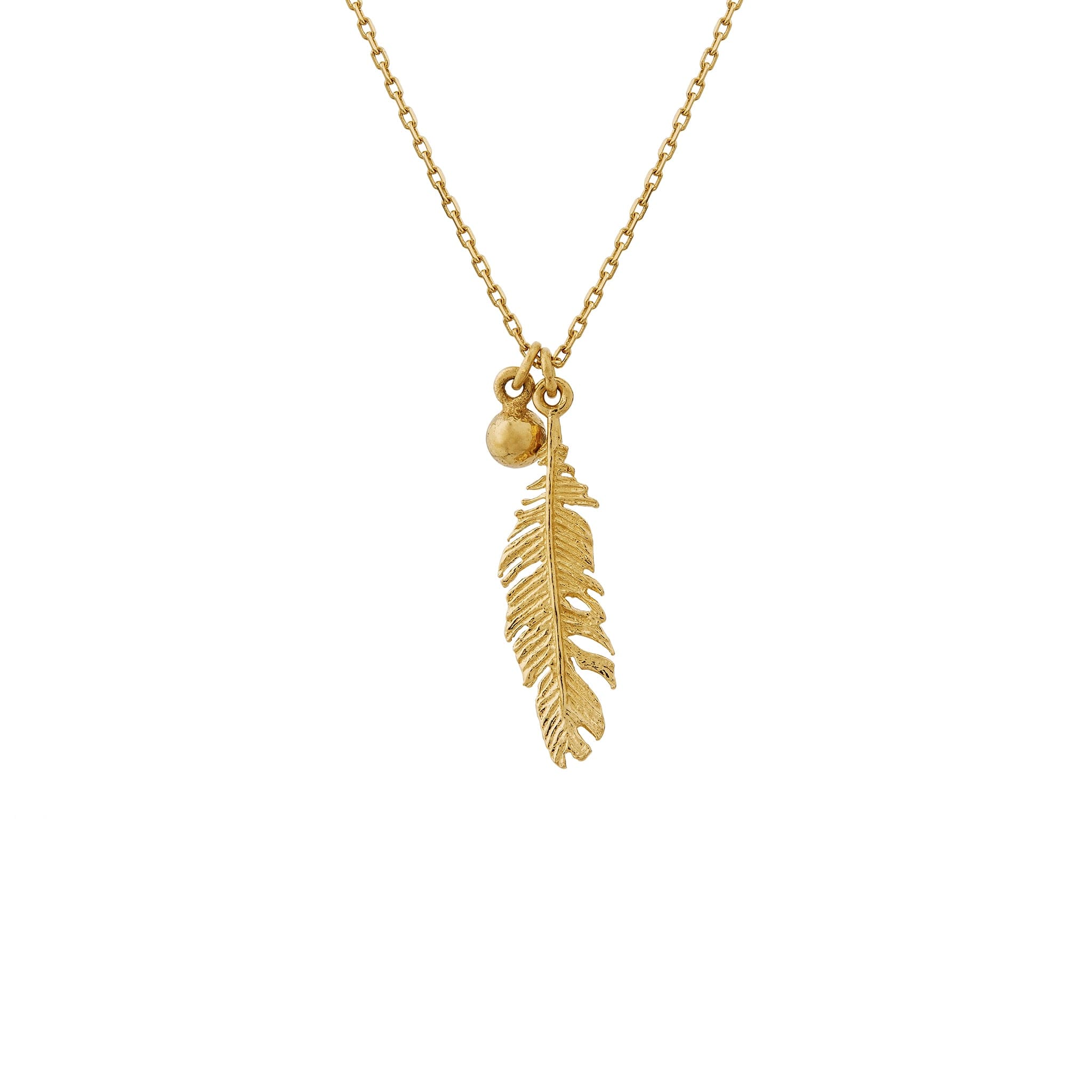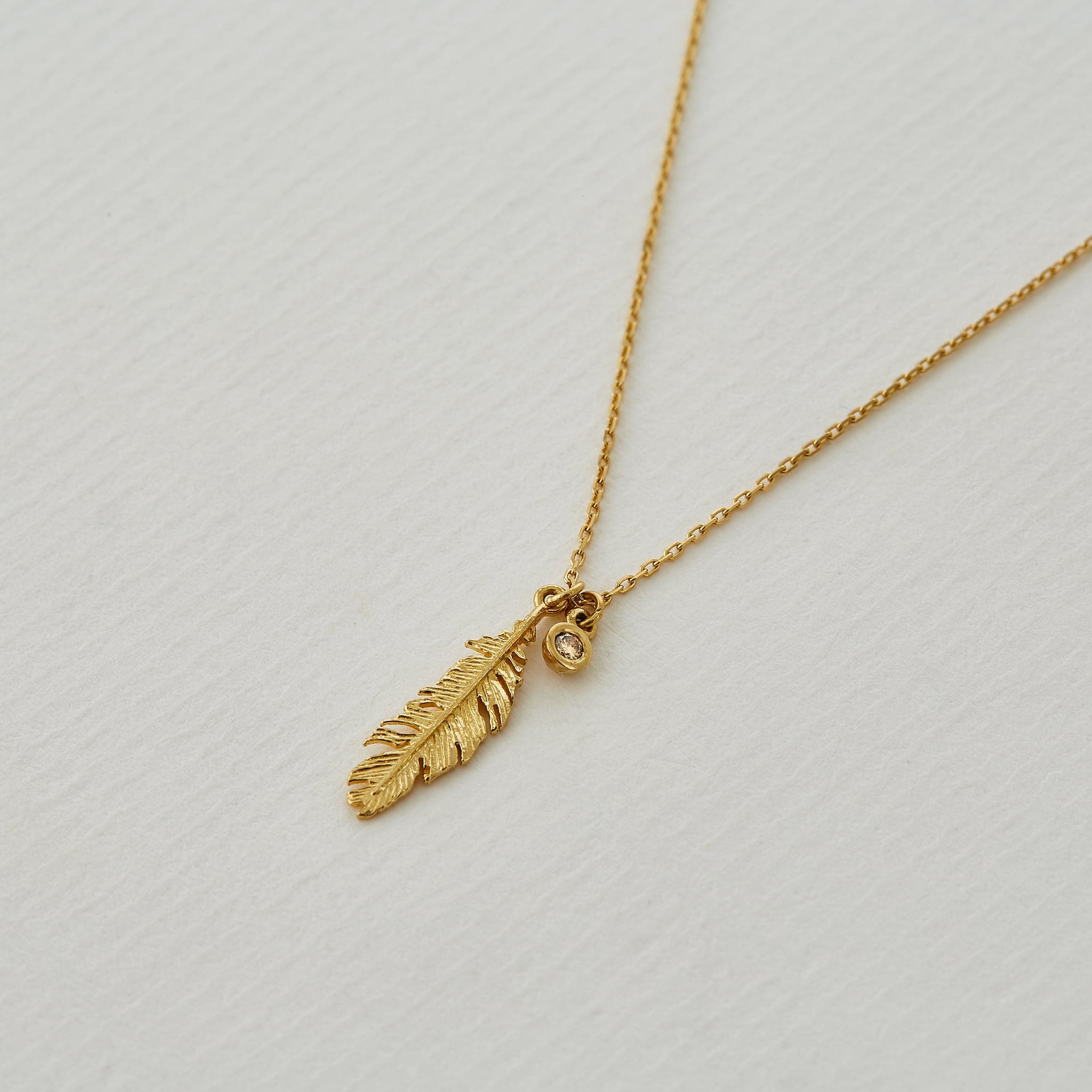 An 18ct gold feather and champagne diamond charm are gently suspended from a delicate trace chain in this fine, pendant necklace. Feathers float to form loops and barely-there wisps land gently on the skin in Plume - one of the most delicate and intricate jewellery collections Alex has ever created, handcrafted from solid 18ct gold.