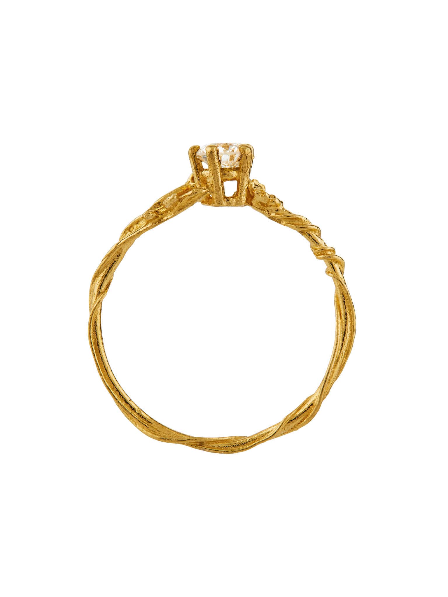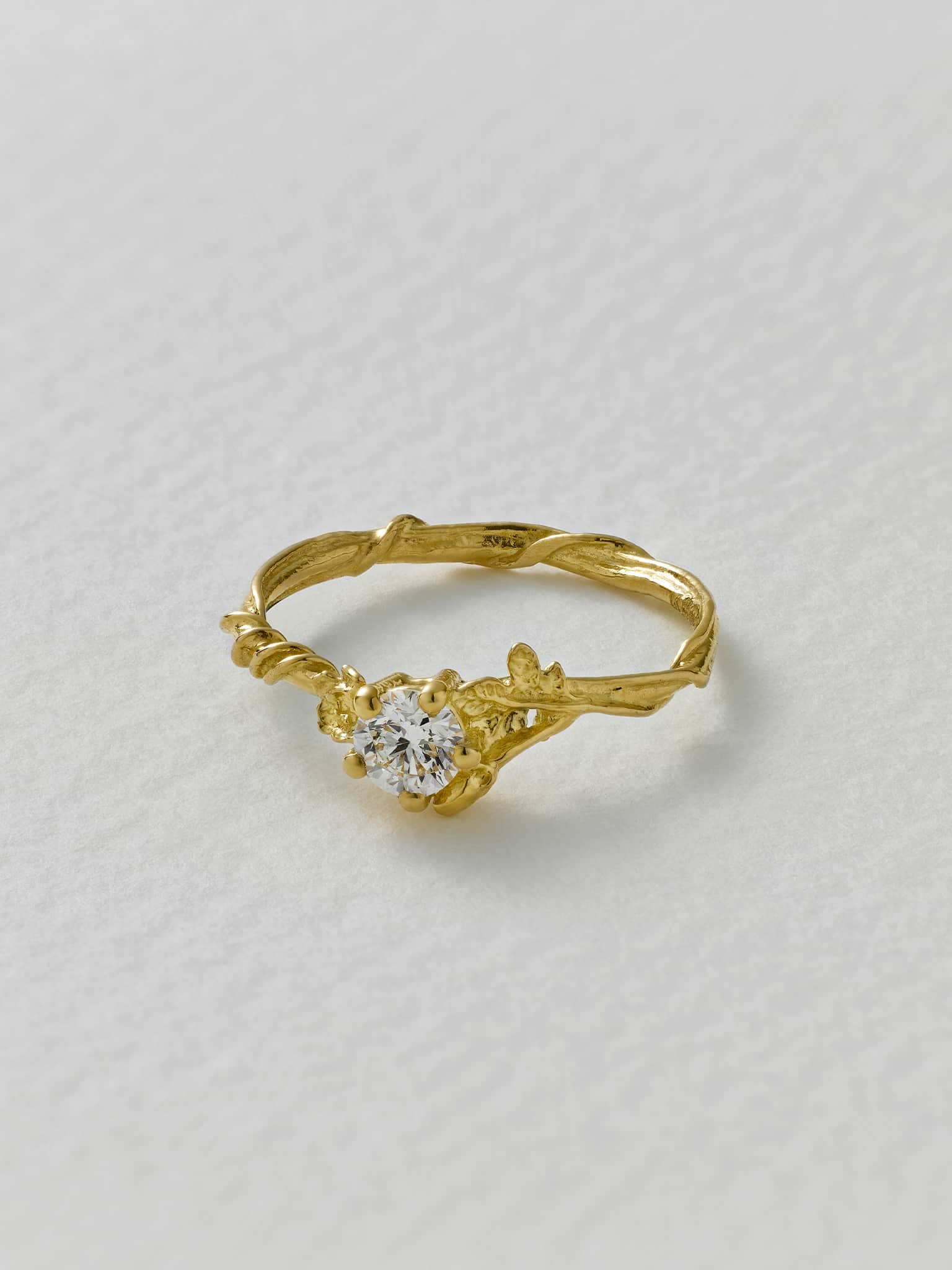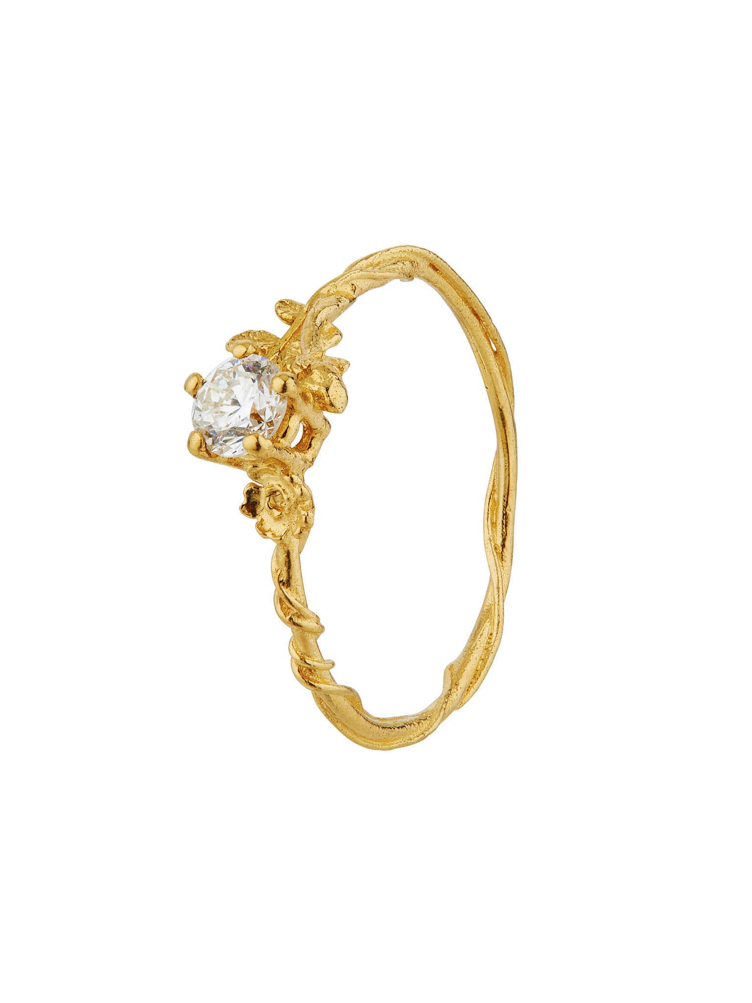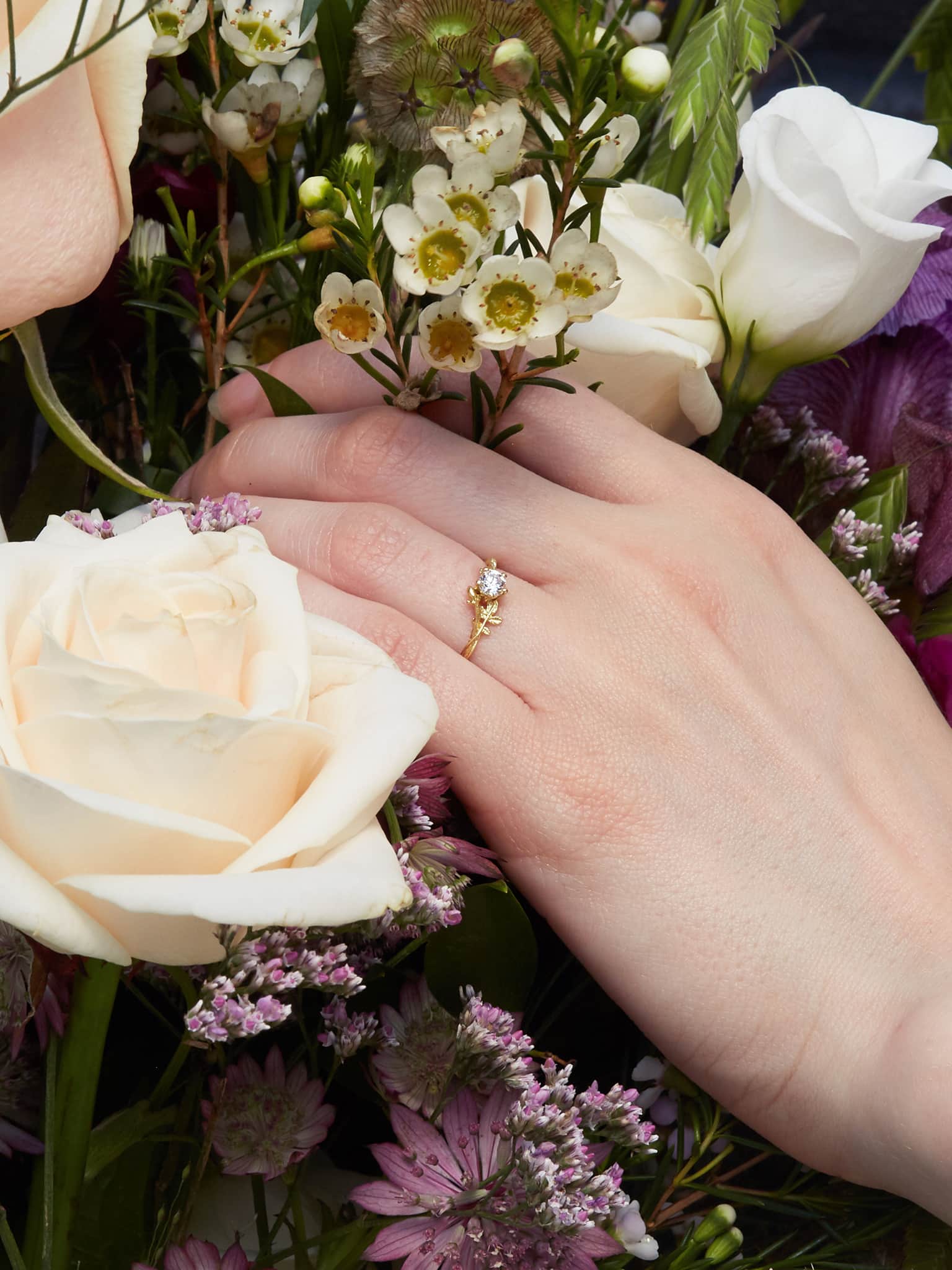A diamond sparkles from our delicate 18ct gold Rosa Alba Ring, detailed with wild roses, leaves and vines. Designed as both an engagement ring or simply a luxury treasure, Alex Monroe Fine Jewellery is designed and handmade in our London Studio.
