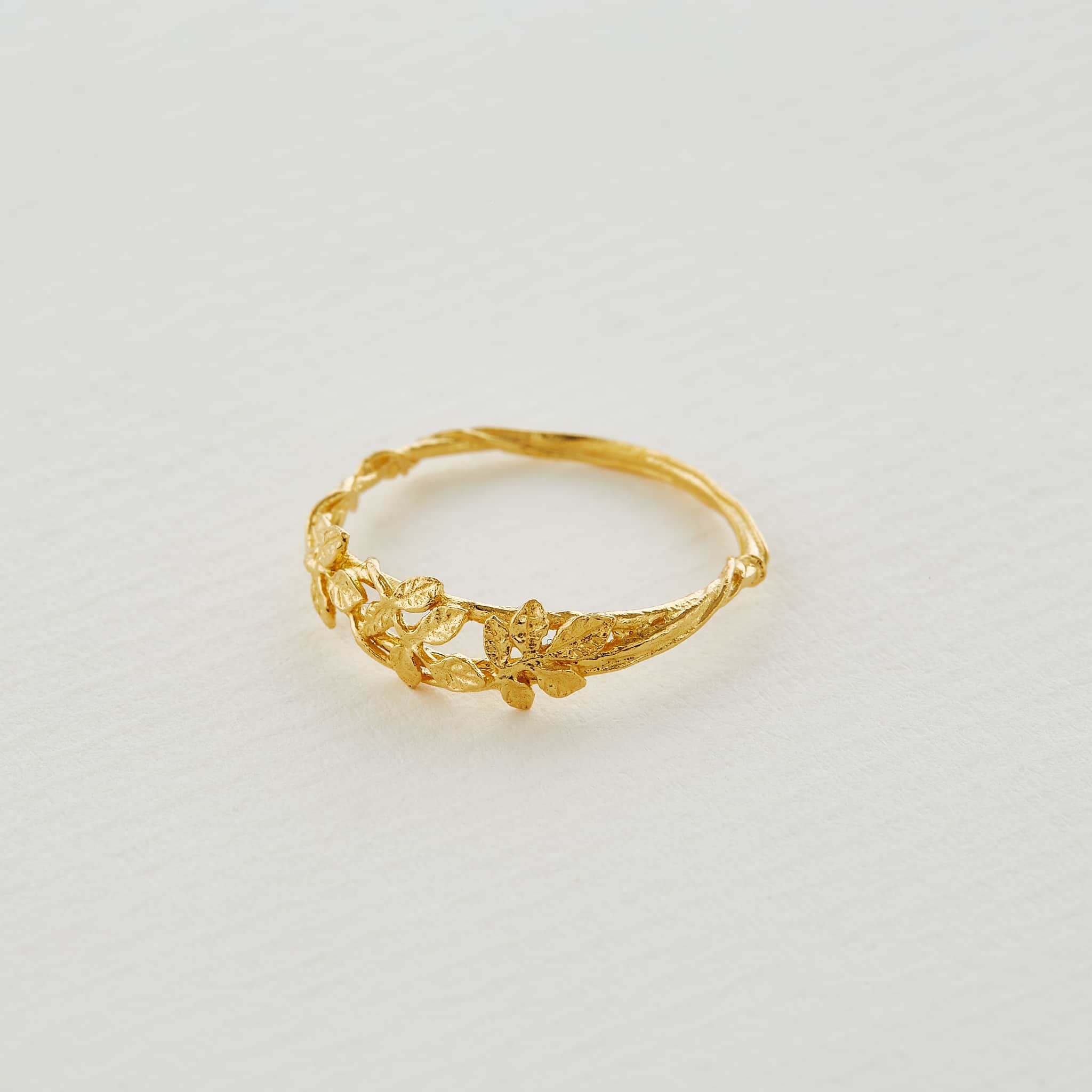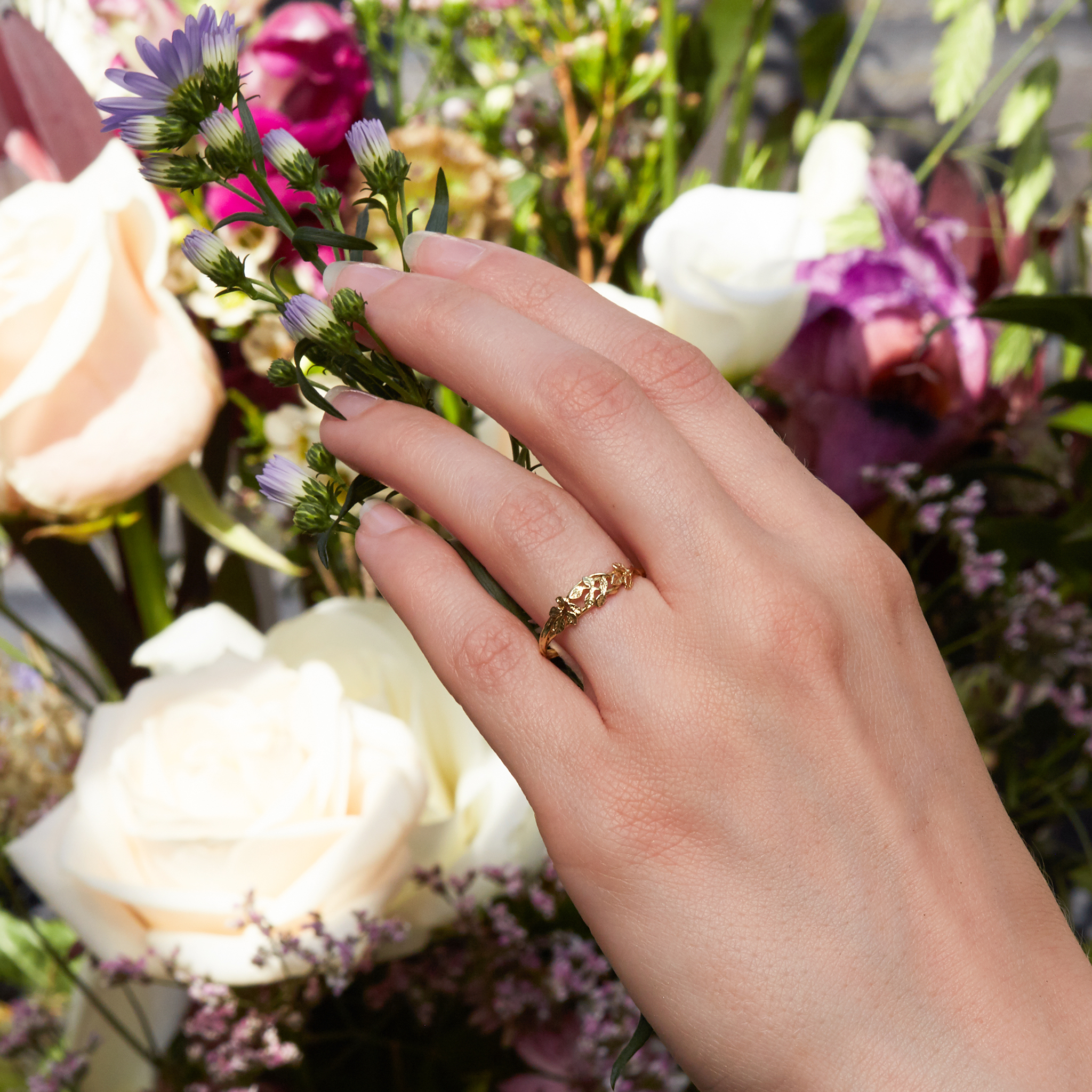 A branch of wild rose leaves entwine to form an 18ct gold fine ring, inspired by nature. Designed as both a wedding band or simply a luxury treasure, Alex Monroe Fine Jewellery is designed and handmade in our London Studio.
