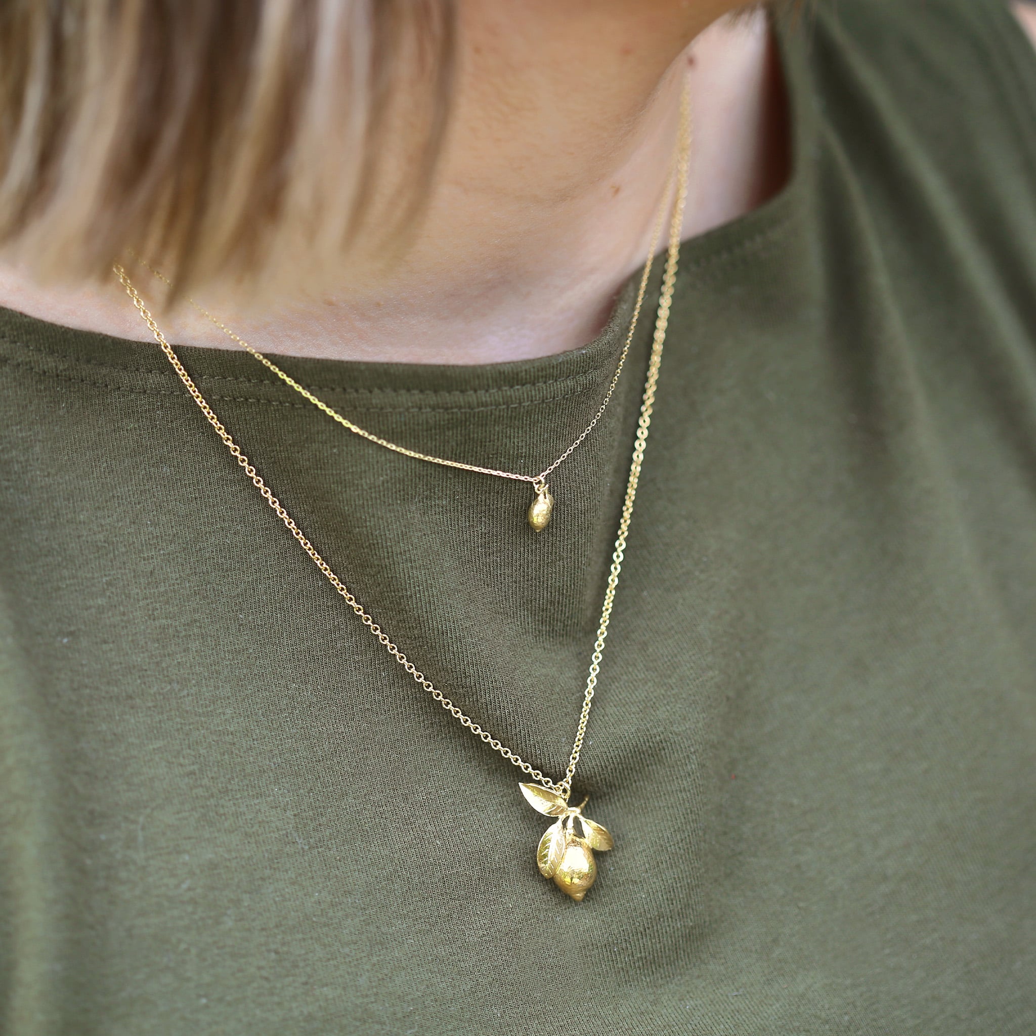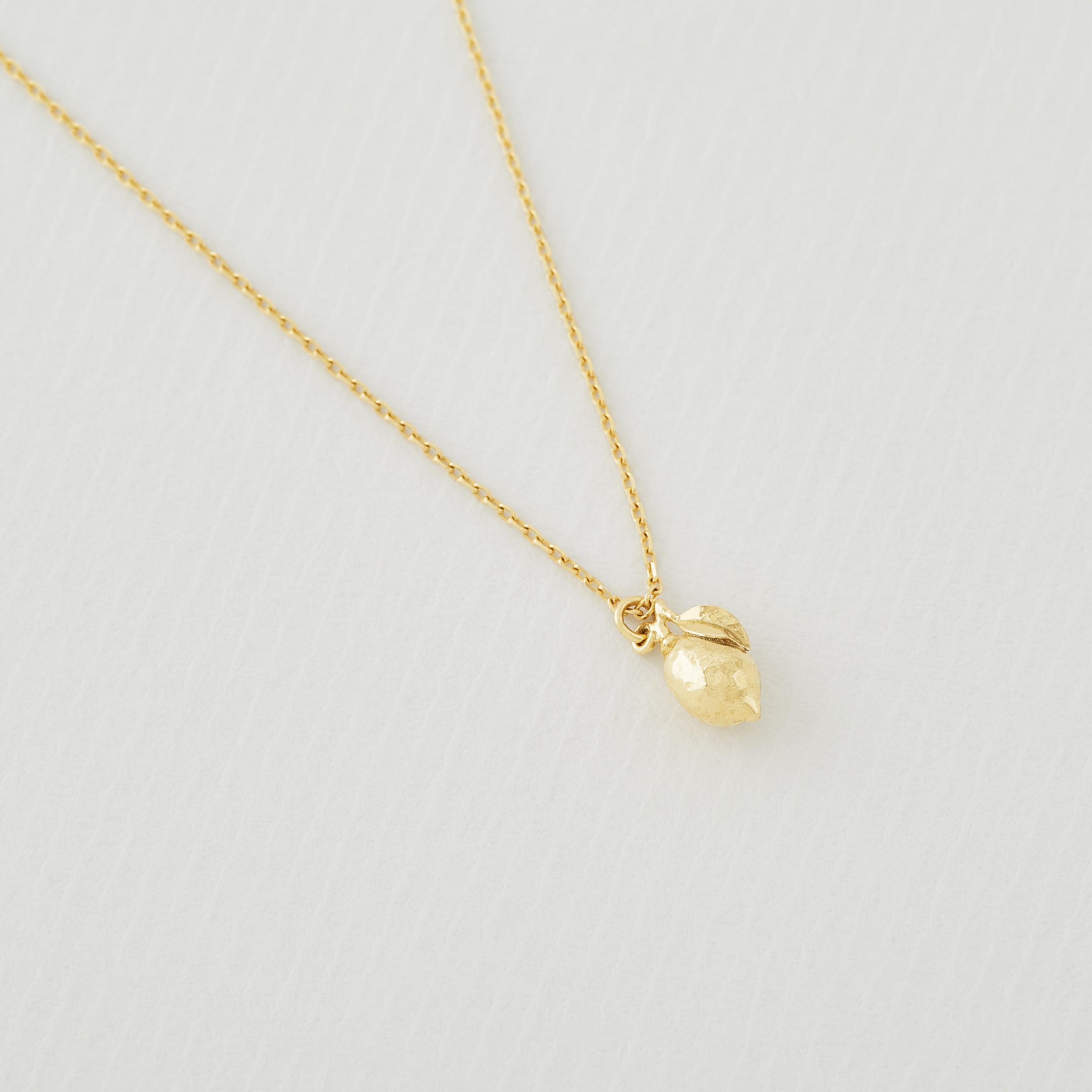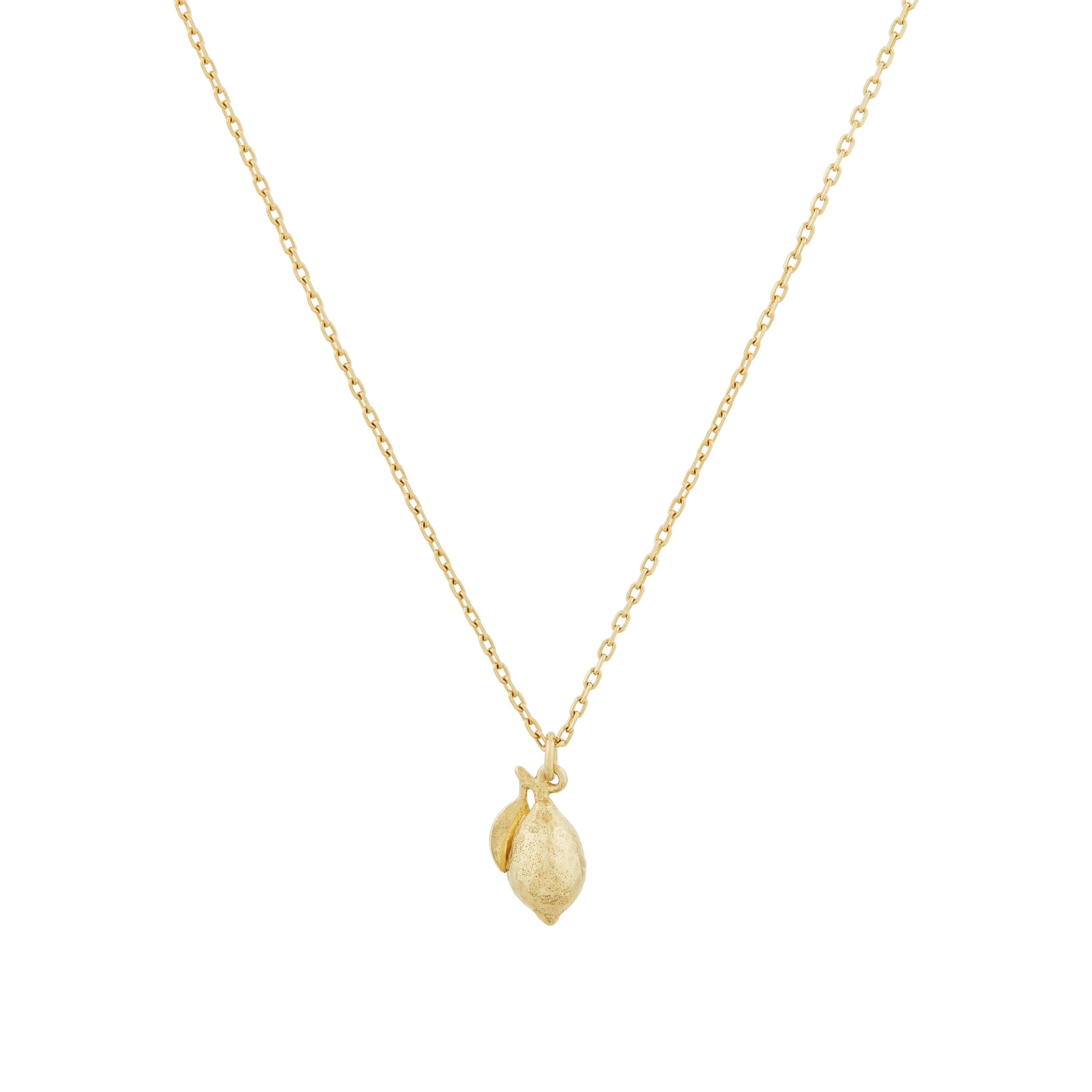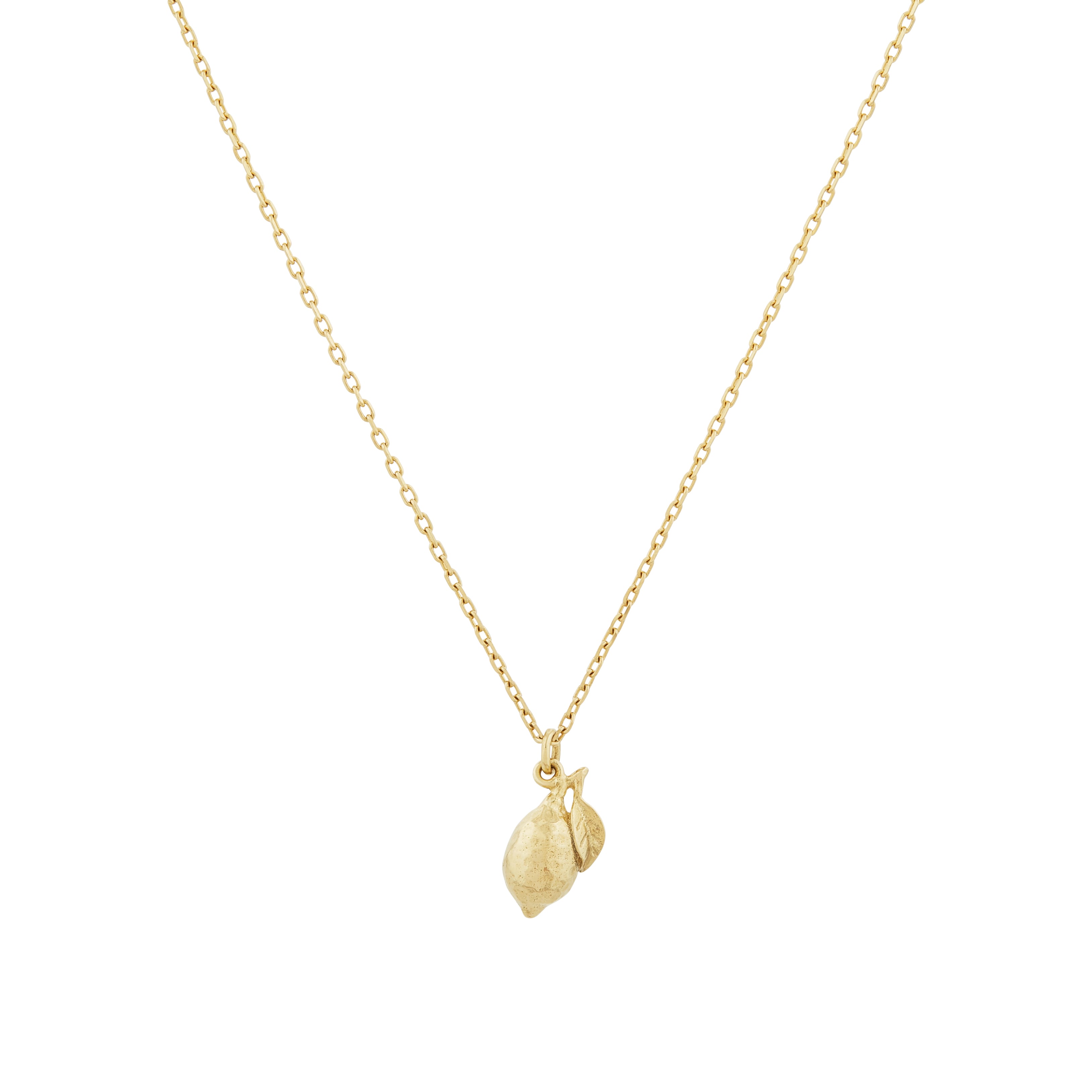 A luscious little lemon complete with tiny leaf have been recreated in miniature. Gently moving in the breeze, this 18ct solid gold necklace is a fruity nod to summer.