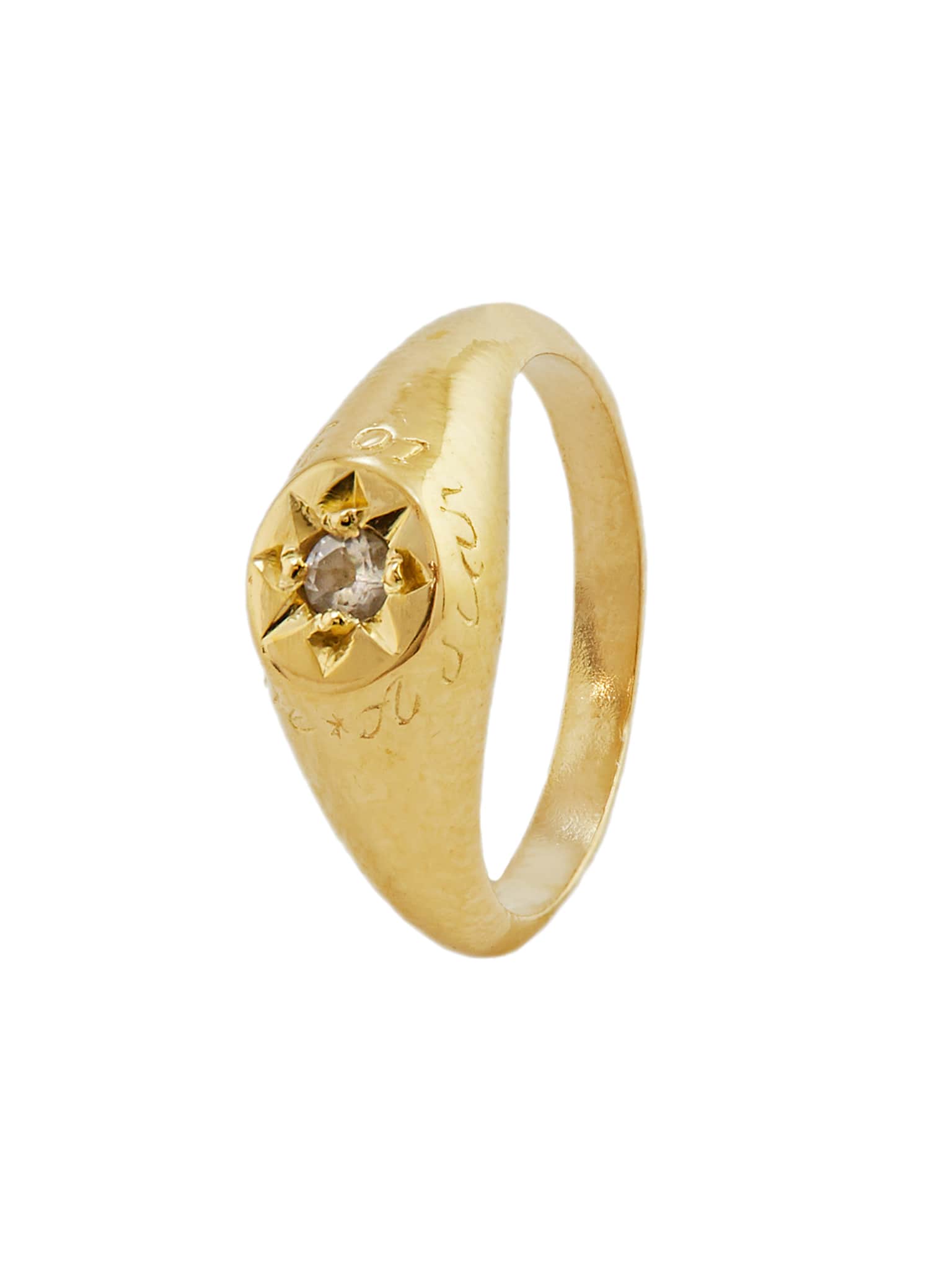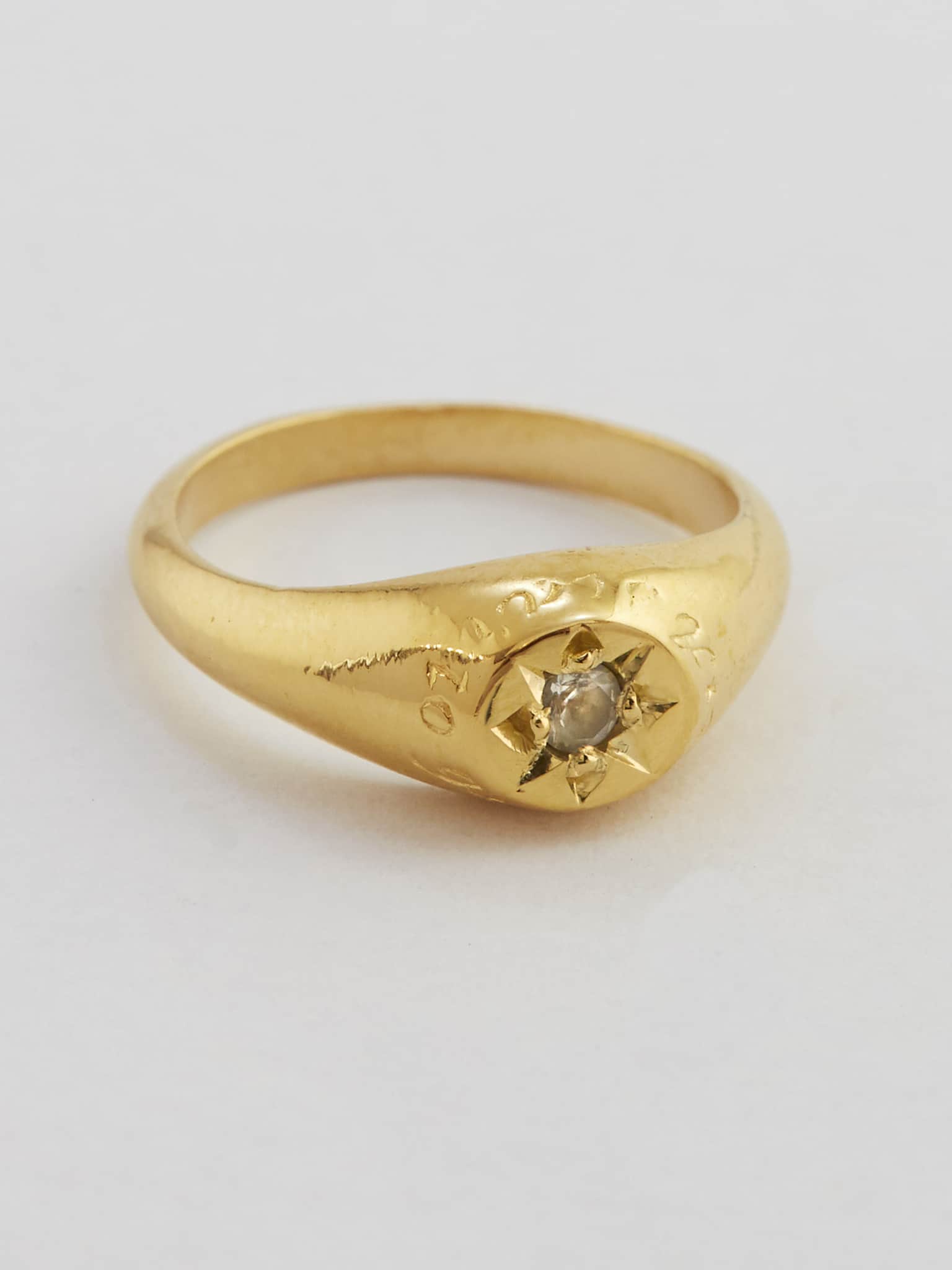 A star-set white topaz radiates from the centre of this polished signet ring. Look closely and you’ll spot the words ‘A Star to Guide Me’ engraved around the top.