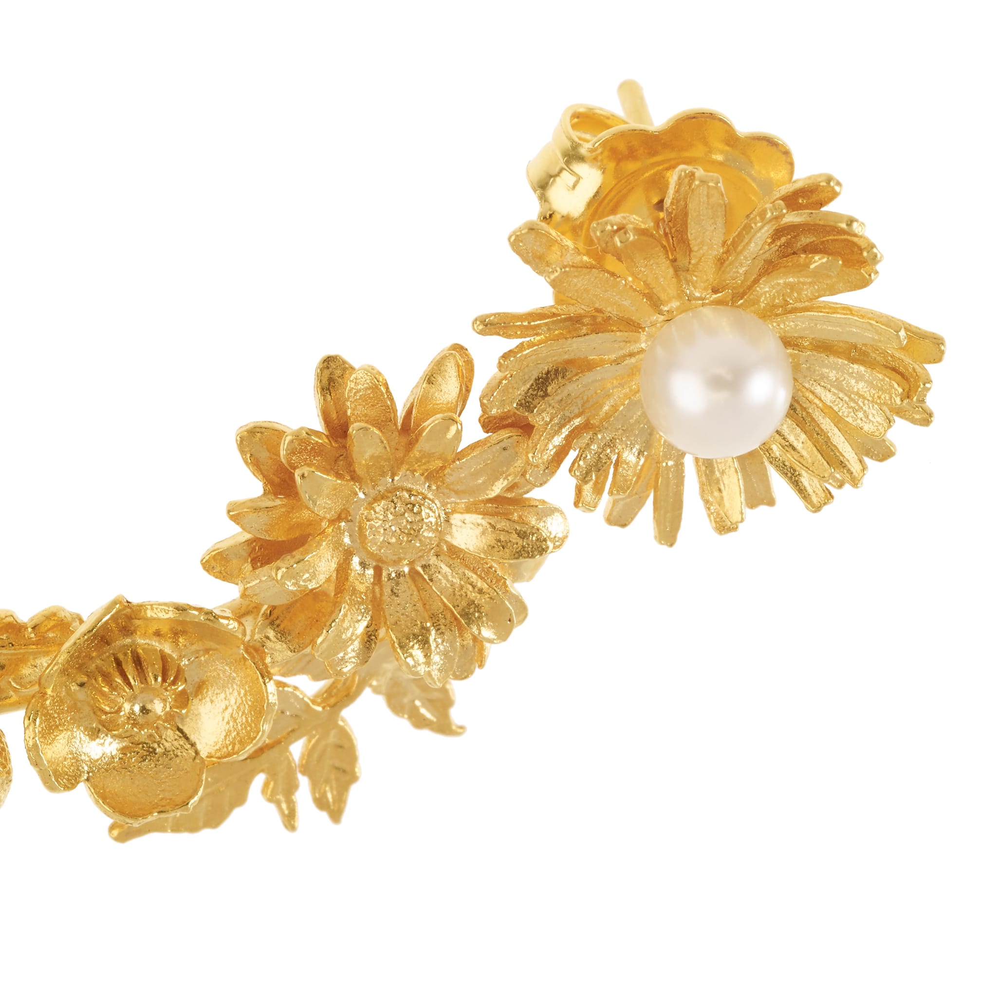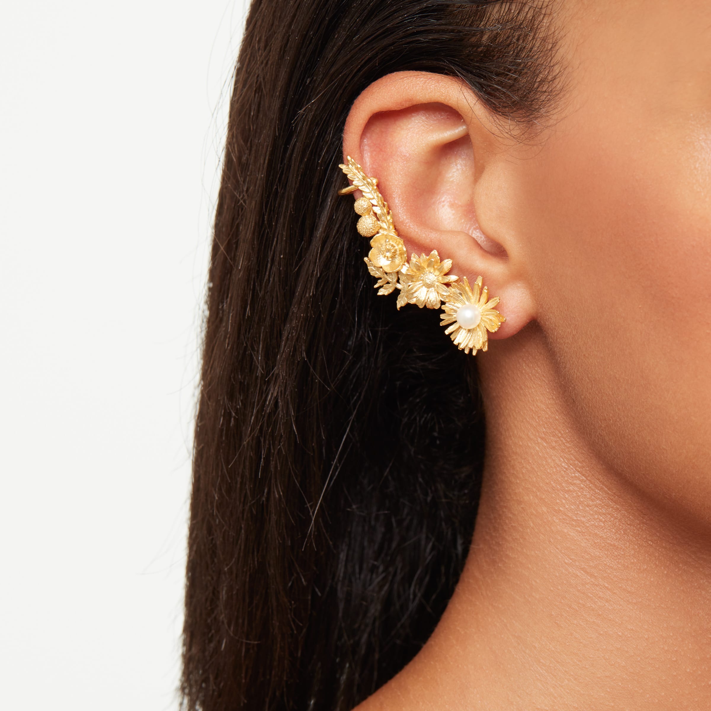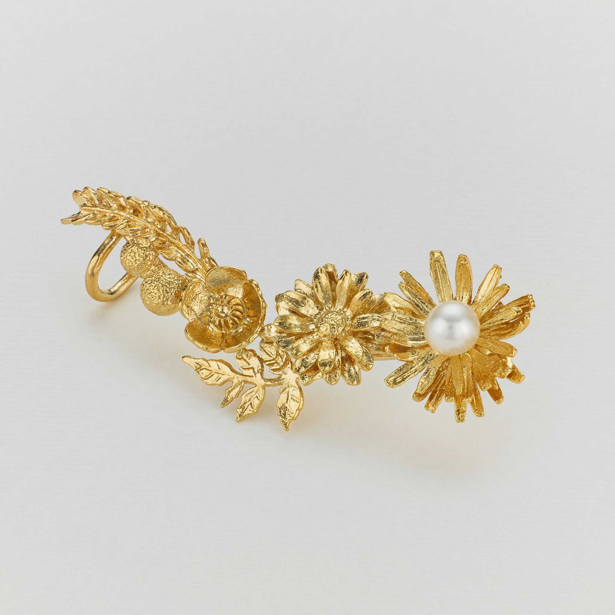 Woodland flowers and leaves bloom to form a statement climber earring, accented with a freshwater pearl! Our fashion week collaboration with Sophia Webster, titled 'Away with the Fairies' centered around winged earpieces, dandelion charms and woodland texturing captured in Alex's signature delicate detail.